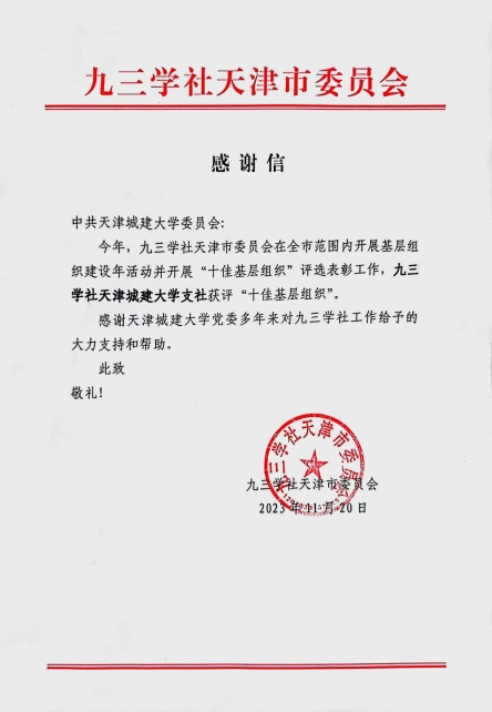 近日,在九三学社天津市委员会基层组织建设年活动总结表彰会上,Beat365官网九三支社获评九三学社天津市委员会“十佳基层组织”荣誉称号。九三学社市委会专门发来感谢信,对中共Beat365唯一官方网站委员会表示感谢。