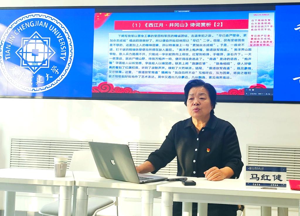 马红健以毛泽东诗词为主线,讲述中国新民主主义革命历程。她告诉学生毛泽东诗词意境高远,思想丰富,充满雄心、意志和勇气,既展现了人生奋斗的心路历程,又充满了化解现实危机的韬略智慧。活动中,同学们在老师的感召下齐声共诵伟人诗词,橘子洲头的万山红遍、井冈山上的旌旗在望、重阳节的战地黄花、万里长征的不怕远征难一一再现。同学们纷纷表示通过诗词能够感受到伟人深邃的思想和广阔的胸襟,老一辈无产阶级革命家身上的高尚品格和斗争精神激励着青年学生不断拼搏进取、建功立业。