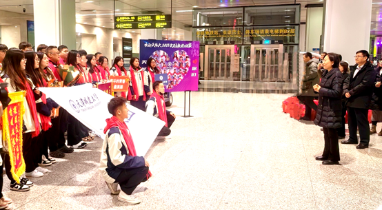 支教团一行抵达后,在机场大厅举行了温馨热烈的接机仪式。王罡向带队教师献花,向支教团表示热烈欢迎,与支教团师生亲切交流并致辞,对于支教团赴疆工作取得的成绩给予了充分的肯定。她表示,支教团师生面对陌生的环境、克服重重困难,用“衣带渐宽终不悔”的激情,和“俯首甘为孺子牛”的信仰,为新疆和田地区的教育事业贡献了自己的力量,展现了天城大人的风采。她希望大家继续保持高度的责任感和使命感,坚守天城大人的初心和品格,在不同的身份中“有一分热,发一分光”,带着支教这份宝贵的回忆和经验,接续奋斗、砥砺前行,让青春在追逐梦想的道路上绽放出更加绚丽的光彩!