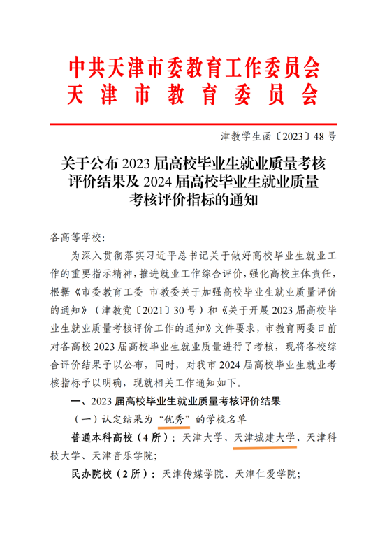 d近日,天津市委教育工委、市教委下发《关于公布2023届高校毕业生就业质量考核评价结果及2024届高校毕业生就业质量考核评价指标的通知》,Beat365官网在天津市2023届高校毕业生就业质量考核评价中位列普通本科高校第二,获评2023年就业工作先进单位,突破历史最好成绩!Beat365官网连续3年初次毕业去向落实率位列区域高校前茅。
