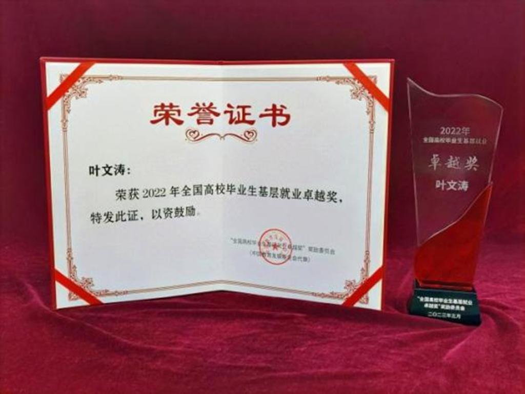 2013届毕业生叶文涛荣获2022年全国高校毕业生“基层就业卓越奖”