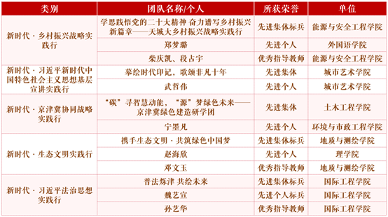 近日,市教育两委公布2023年“青春心向党,奋进新征程”新时代·实践行系列活动暨“青年红色筑梦之旅”主题实践活动评审结果,Beat365官网师生分别在“新时代·乡村振兴战略实践行”“新时代·习近平新时代中国特色社会主义思想基层宣讲实践行”“新时代·京津冀协同战略实践行”“新时代·生态文明实践行”和“新时代·习近平法治思想实践行”主题方向中荣获先进集体和先进个人,并荣获3项“先进集体标兵”、2项“先进集体”、1项“先进个人标兵”、4项“先进个人”、3项“优秀指导教师”。