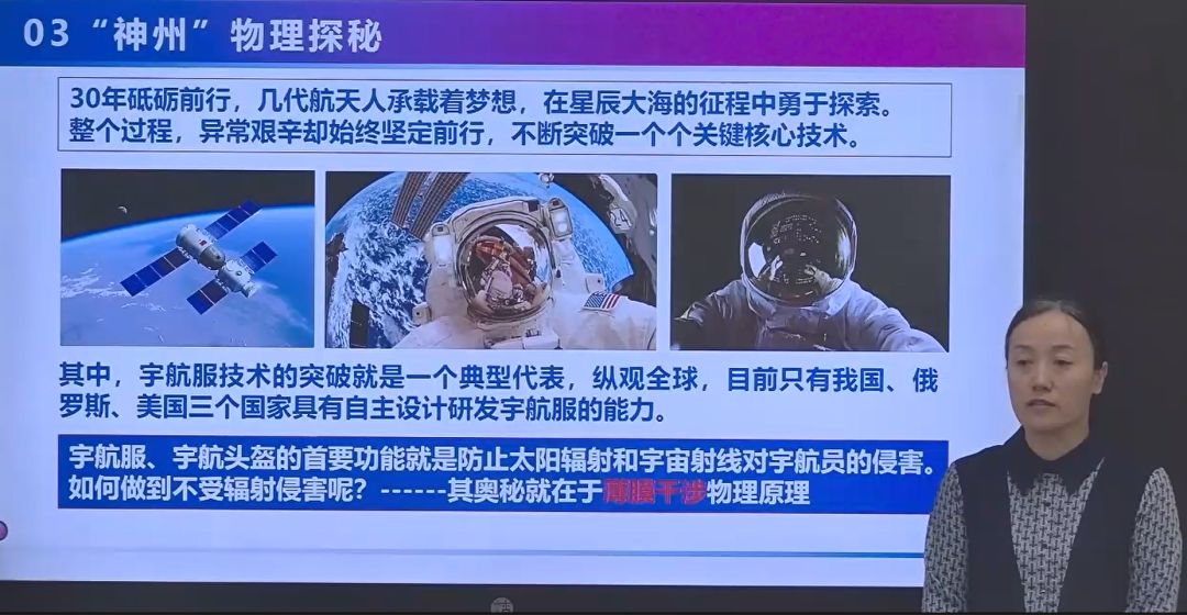 理学院古金霞老师的《炫彩薄膜干涉筑梦“神州”遨游太空》讲述从蓝图绘梦到奋斗圆梦,整整30年中国航天人接续奋斗,在星辰大海的征程中勇于探索,不断突破掌握载人航天技术。其中,应用薄膜干涉物理原理自主研发的宇航服就是典型代表之一,以此激发同学们的爱国热情,引导其学以致用,勇攀科学高峰。