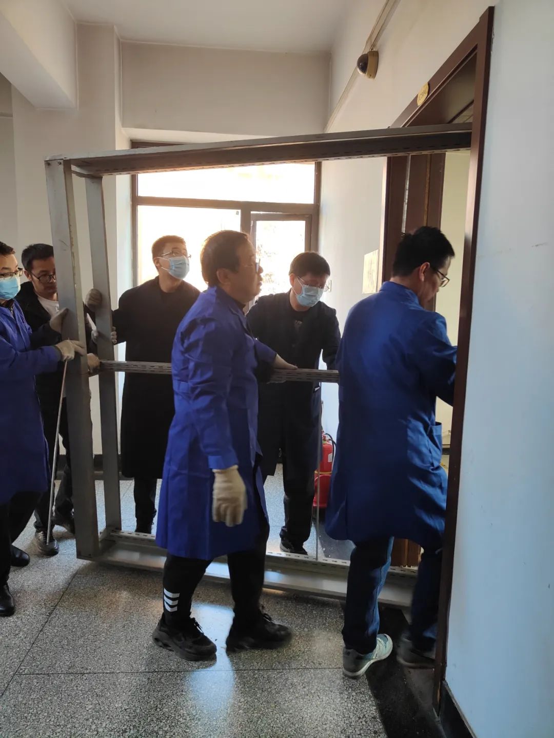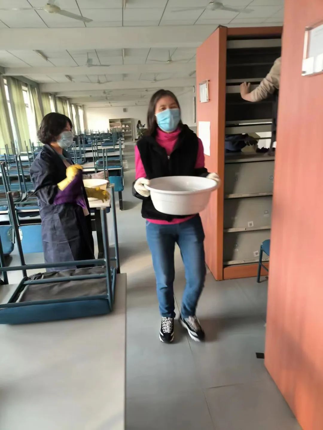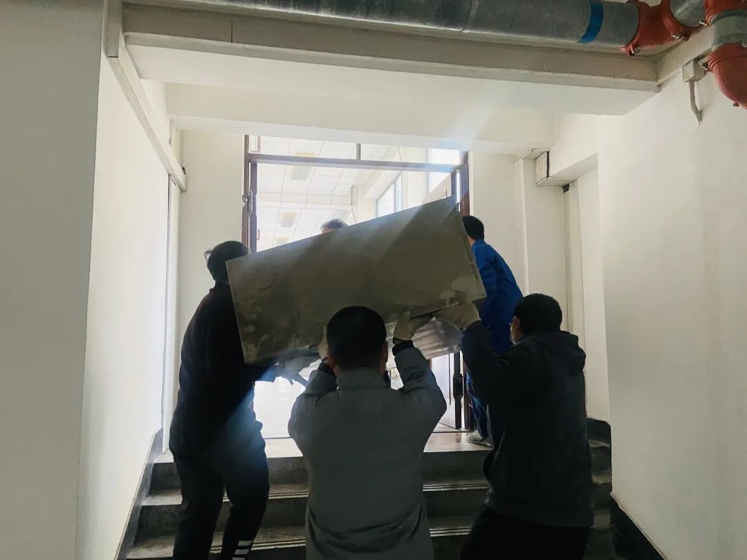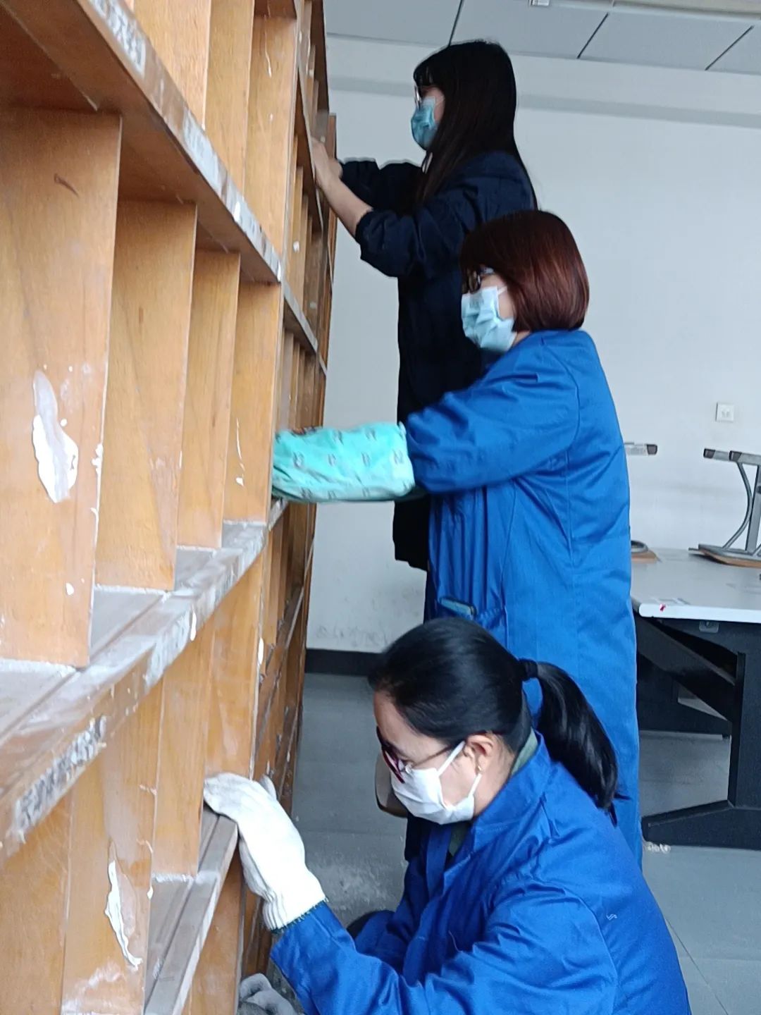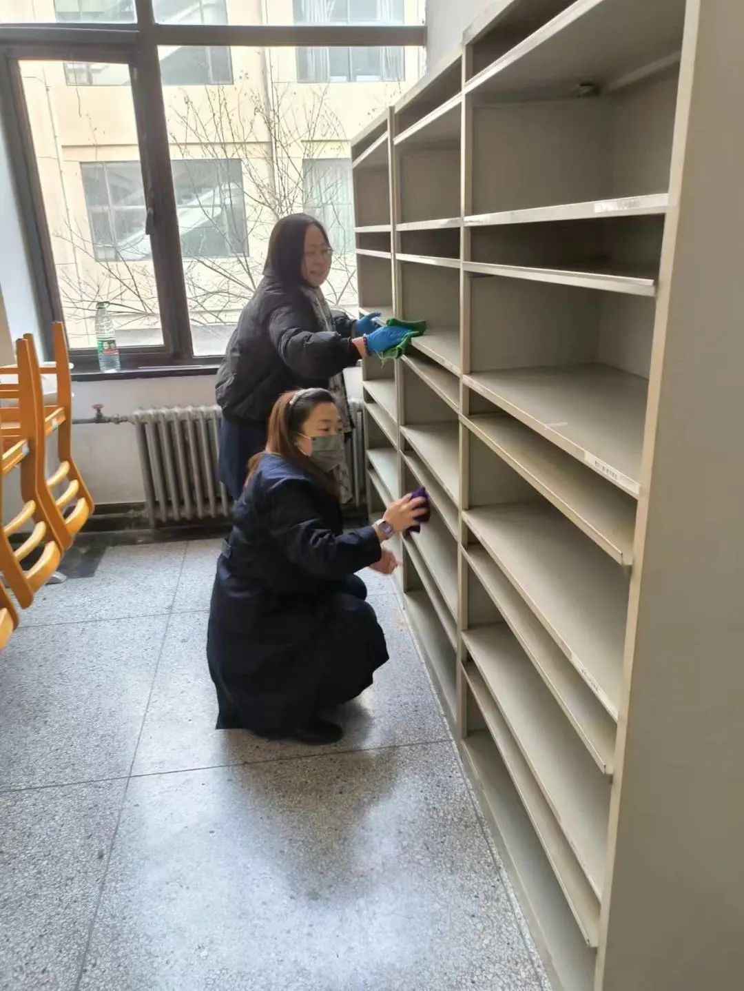 书格架找到了,如何能顺利安全摆放到位满足使用呢?连日来,馆内每天一早就将当天的任务安排发布到工作群,大家就自觉主动认领任务积极工作。全馆男教职工几人一组,手搬肩扛、抬运车拉安全顺利完成了40余组书格书架和70余个条桌的拆卸、组装和固定安置工作,对个别尺寸较大的男教工们就手把手接力一个台阶一个台阶地从一层楼爬到高一层楼。全馆女教工也不甘示弱,按照部门分成三组纷纷拎起水桶端起水盆拿起抹布打上热水对所有书格书架、个别房间电线网线及环境卫生进行清理保洁。尽管每天大家的劳动工作内容随着“战场”调整都会变化,但团结干事的热情和为同学们创造更好学习条件的师者仁心没有丝毫变化。