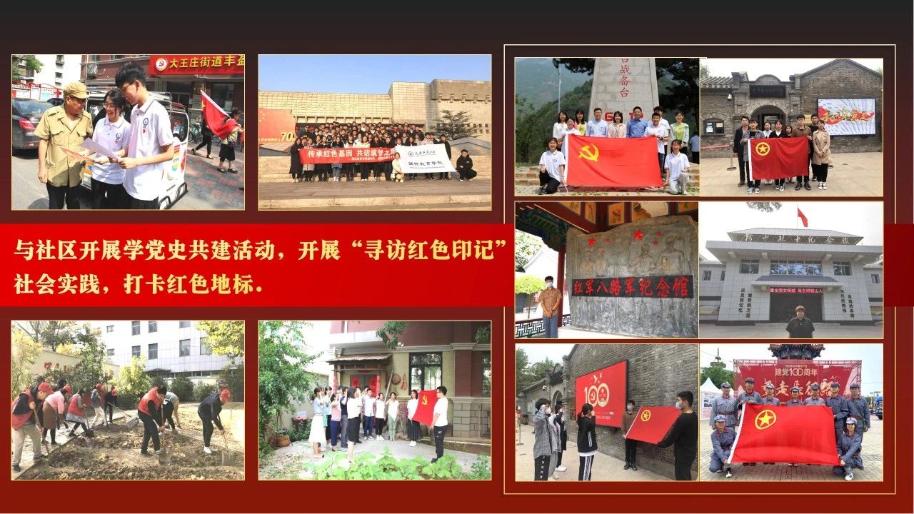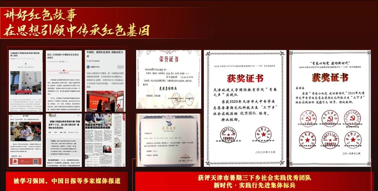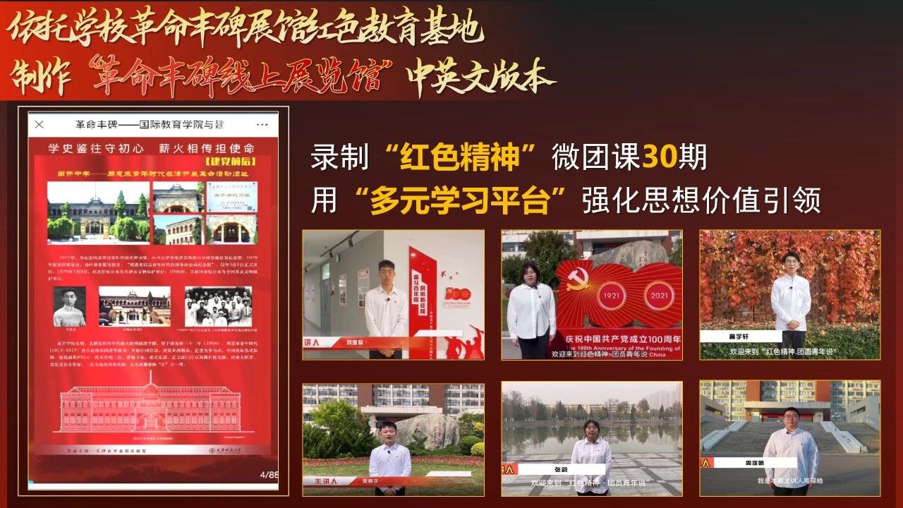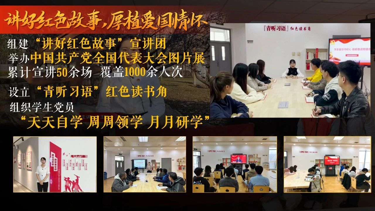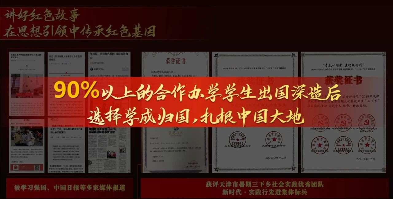 她组建“讲好中国故事”宣讲团,在学院举办中国共产党全国代表大会图片展,累计宣讲50余场,覆盖千余人次;设立“青听习语”红色读书角,组织党员“天天自学 周周领学 月月研学”;制作“革命丰碑线上展览馆”中英文版本,录制“红色精神”微团课,用“多元学习平台”强化思想价值引领。与社区开展学党史共建活动,开展“寻访红色印记”社会实践,被学习强国、天津日报等多家媒体报道。获评天津市暑期三下乡社会实践优秀团队,新时代·实践行先进集体标兵、指导学生获“互联网+”比赛天津市三等奖等。学院90%以上的合作办学学生出国深造后选择学成归国,扎根中国大地,勇担时代使命。