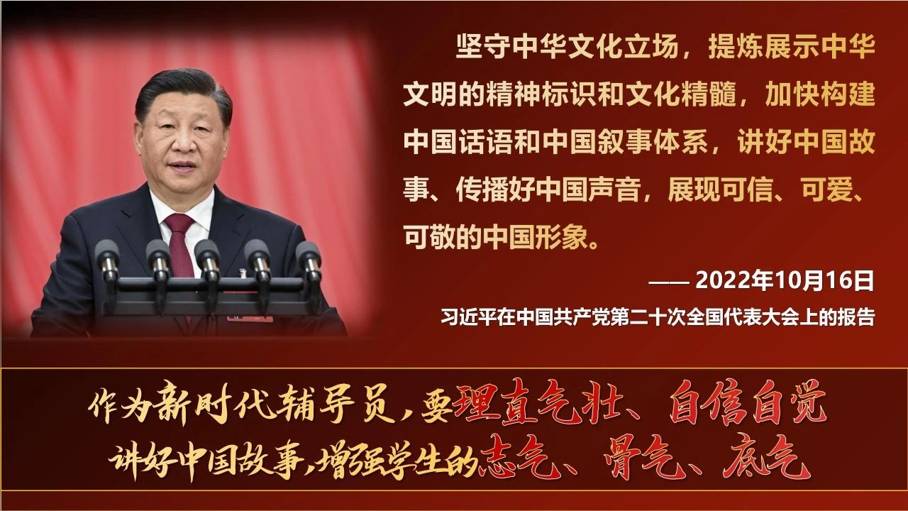 习近平总书记在党的二十大报告中指出,要讲好中国故事、传播好中国声音。作为新时代的辅导员,就是理直气壮、自信自觉讲好中国故事,增强学生的志气、骨气和底气。