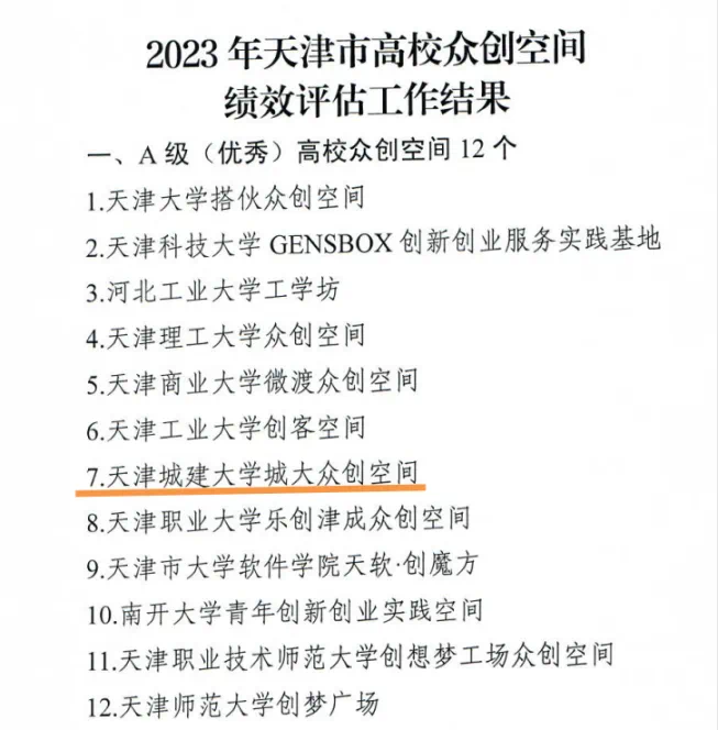 众创空间连续八年获评天津市A级(优秀)高校众创空间。依托天津市高校众创空间电商协同培育中心积极开展市级系列双创活动,服务全市高校创新创业建设。组织师生积极参加各类创业大赛实践,在“创青春”青年创新创业大赛、天津市大学生新媒体创新创业大赛、天津市大学生创客马拉松大赛等活动中斩获多项佳绩。组织师生及创业团队前往天开园开展学访、交流、路演等活动,助力天开园建设。在第十八届“挑战杯”全国总决赛中斩获主体赛二等奖1项,“黑科技”专项赛“星系”级作品(最高奖)1项,实现了学校参加“挑战杯”竞赛新的突破。连续三年荣获“挑战杯”天津赛区“优胜杯”并获“优秀组织奖”。6名学生荣获天津市大学生创新创业奖学金。4门课程获批天津市创新创业教育特色示范课程,《大学生职业发展与就业指导》《创业管理》两门课程首次入选2023年天津市高校就业创业金课。