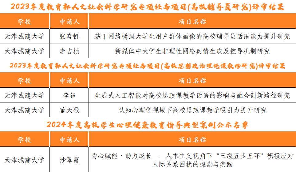 纵深推进“辅导员队伍素质提升工程”,积极构建辅导员队伍高质量培养体系。2名辅导员获批教育部人文社科研究专项任务项目(高校辅导员研究)立项;1名辅导员获批教育部2024年度高校思想政治工作质量提升综合改革与精品建设项目立项,1名辅导员负责的课程入选2023年天津市高校就业创业“金课”。3人获批2023年度天津市高校思想政治工作精品项目;在天津市高校辅导员工作优秀案例征集中获评二等奖2项,三等奖1项;5人获批天津市大中小思想政治工作专项课题立项;4人获评天津市“三全育人”优秀工作案例;3项就业工作案例入选《天津市高校毕业生就业观教育工作典型案例集》;在天津市高校辅导员思想政治教育“精彩一课”视频公开课大赛等思政评选活动中斩获佳绩。在天津市高校辅导员素质能力提升骨干训练营比赛中,周涵、姜丽晶分获一、二等奖,周涵获评“天津市十佳辅导员”,姜丽晶、赵彤获评“天津市优秀辅导员”。