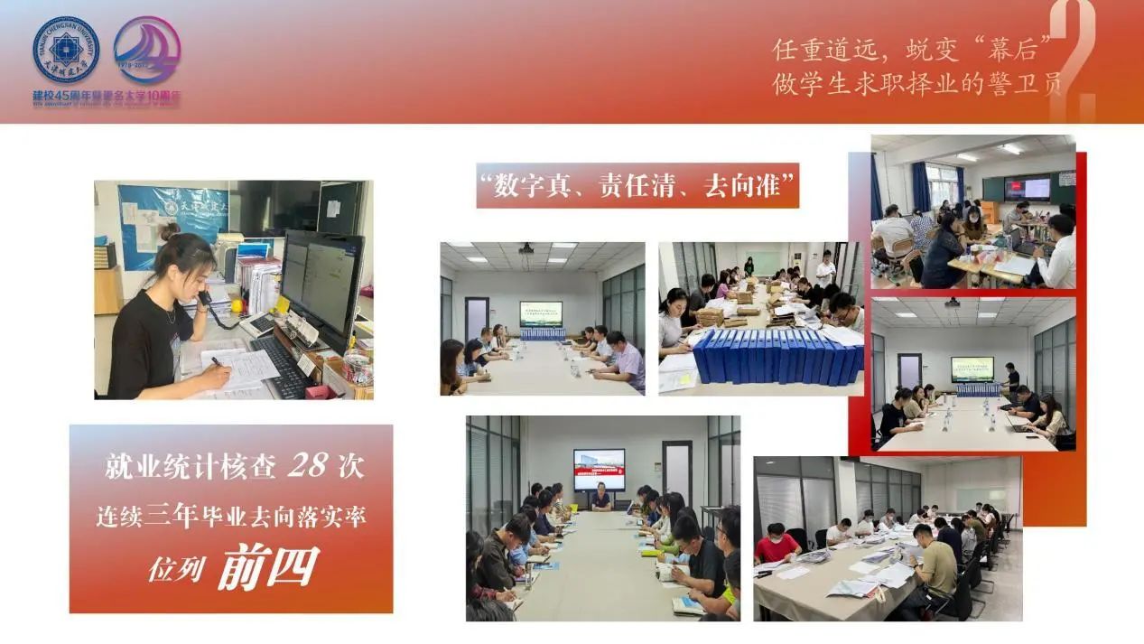 2020年10月,她转岗至就业指导中心,迎来青春长征的转折点。走好责任之路,她以“高站位、精标准、强措施”的工作态度,做学生求职择业的警卫员。“挂图作战”倒排工期,每天“一张表”,实时跟踪毕业生网签情况、求职进度;每周“一张图”,精细化对比同期就业数据,加强就业状况分析研判;每月“一目标”,对标院级目标确保责任落实。三年来,制作、上报各类就业报表1300余份,完成1.2万余名毕业生就业手续办理。每个就业关键期,“白加黑”审核就业材料,24小时监控学信网反馈情况,组织校级就业核查20轮,配合完成市级核查8轮,每年逐一审核全部毕业生就业材料2轮,确保各项数据准确无误。学校连续三年初次毕业去向落实率在天津市普通本科院校中位列前四,在2023年就业质量考核评价中评为“优秀”。