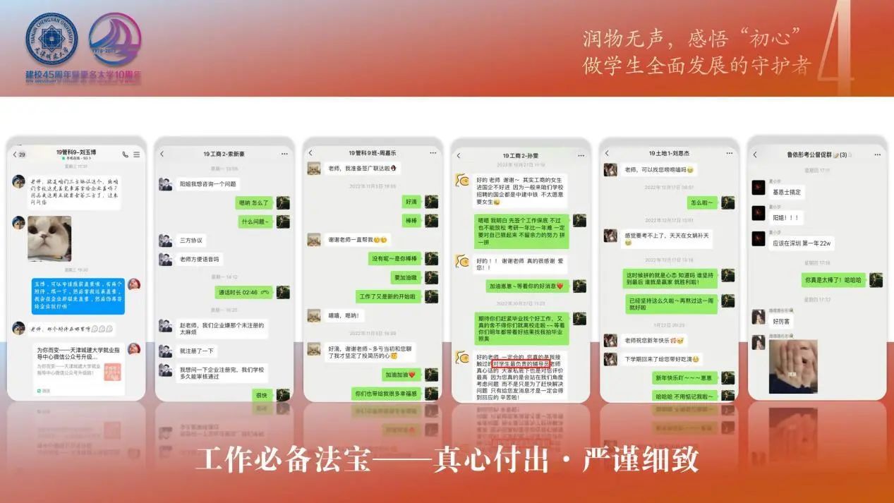 走好奉献之路,她将“有温度、有深度、有态度”的感情注入工作,做学生全面发展的守护者。“学生需要,我就在”是她许下的庄重承诺。疫情期间,身披“红、蓝、白”战衣,为学生健康保驾护航;利用休息时间为来访学生解决求职疑惑;寒暑假期间,随时到校为毕业生办理就业手续。2023年恰逢入职时她所带2019级学生毕业,每天私信解答学生们的问题,她说,当看到孩子们在她的帮助下顺利找到工作,并称她为“超负责的辅导员”时,她深感一切付出都是那么值得!