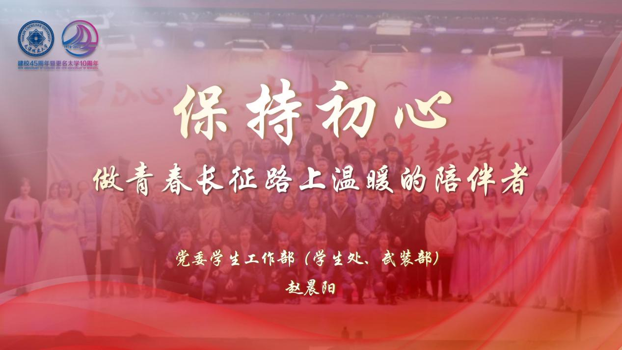 赵晨阳,党委学生工作部(学生处、武装部),政工师。习近平总书记说过,“长征是一次理想信念的伟大远征”。她认为,辅导员与青春同行的旅程也是一次新的长征。
