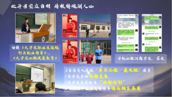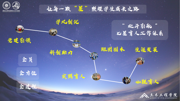 为了让每一个学生都心有所向,她不断在学习中思考,在实践中探索,凝练出党建引领、学风创优、科创助力、实践育人、班团固本、生涯发展和心理育人的“北斗引航”七星育人工作体系,为学生成长成才提供全方位的护航指导,让每一颗“星”照亮学生成长之路。
