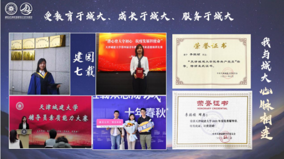 建园七载,见证芳华,她受教育于天城大、成长于天城大,成为辅导员后继续服务于天城大,与天城大心脉相连。入职4年来,先后担任研究生辅导员、本科生辅导员,如何取得学生信赖,让学生在迷茫的时候想得起、在无助的时候靠得住,是她工作以来一直思考的问题和努力的方向。从承担《大学生职业生涯与就业指导》课程教学工作到参与天津市就业金课申报,她不断充电赋能,只为在学生困惑迷茫的时候能及时帮助他们一起寻找答案。在她的影响和感召下,多名学生积极参加学校“薪火班”、“善学计划”、援疆支教、西部计划志愿服务等,在祖国最需要的地方发光发热。