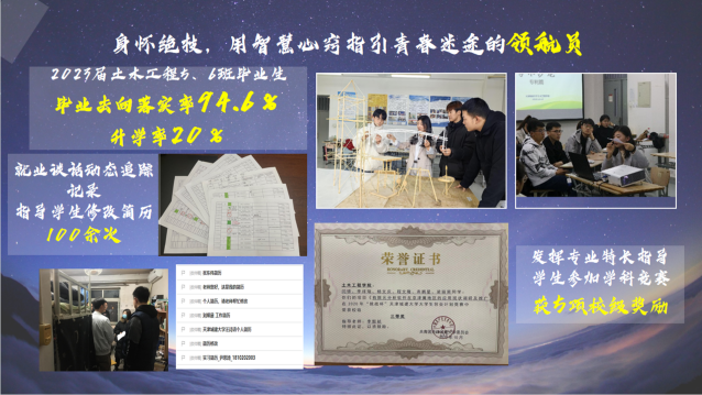 党建引领对话专业价值,带领支部打造“弘扬科技报国志,建功时代心向党”系列微党课;聚焦学风激发青春动力,组织开展“研”值提升计划等系列研学活动20余次;致力科创提升育人成效,构建“阶梯式科技创新活动体系”,打造学院“一系一品”科技工作品牌,本年度承办校级学科竞赛5项,开展教授讲坛·博士论坛系列讲座12期,这一年来学生在“挑战杯”、“互联网+”等各级各类科技竞赛和双创活动中获国家级奖项19人次,省部级奖项70人次,校级奖项600余人次。同时她也积极指导学生参加各类,用实际行动帮助学生以赛促学,实现学习新突破。汇聚群星,让实践生根发芽,带领学生录制“土小木”法律小课堂,用科普照亮学生前行的路,并深入社会基层开展志愿服务,为构建和谐社会贡献自己的星光力量。