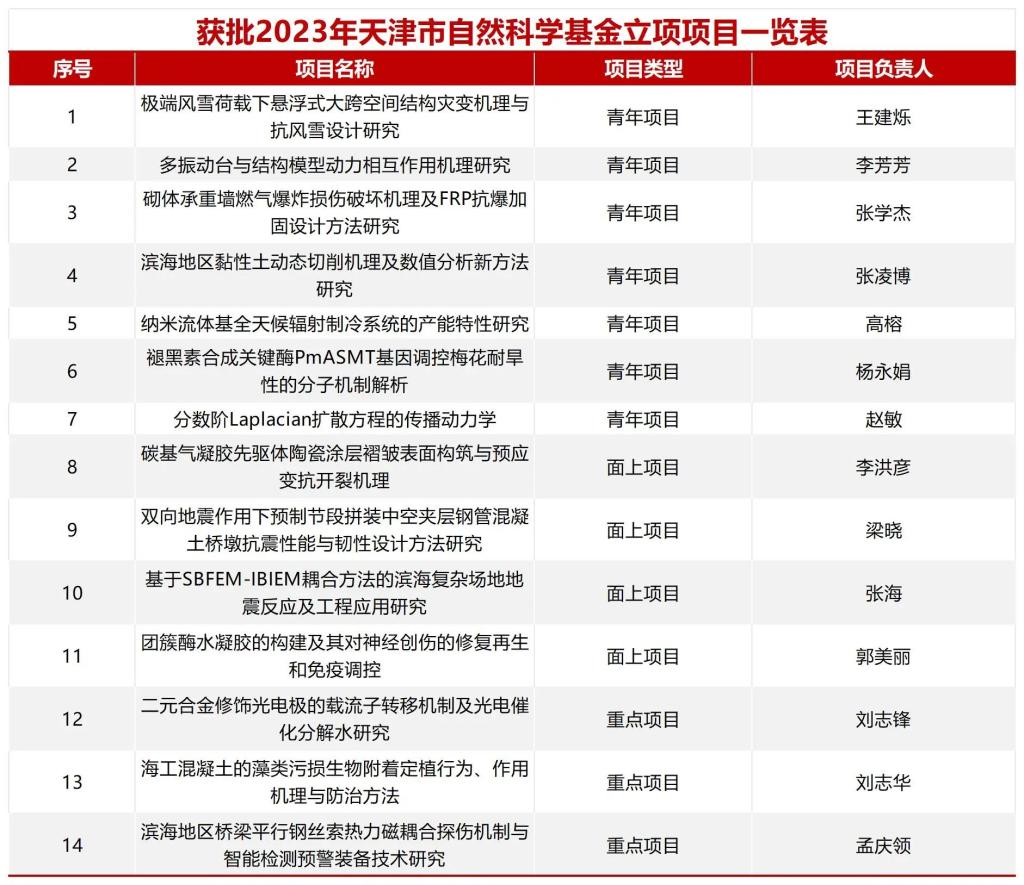 近日,天津市科技局公示了2023年天津市自然科学基金项目立项情况,Beat365官网获批14项,其中重点项目3项、面上项目4项、青年项目7项。本次获批项目数量创“十四五”期间Beat365官网获批数量新高。