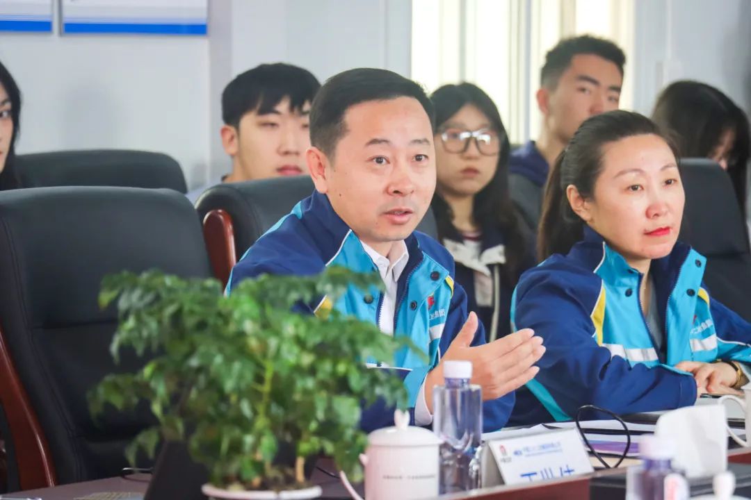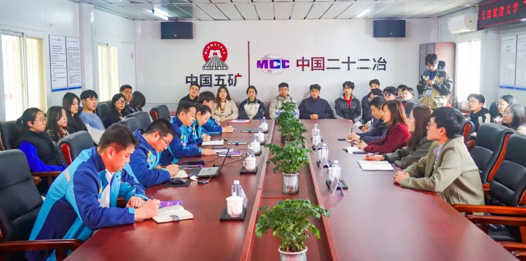 在项目现场实践研学结束后,校企双方举行座谈会并进行互动交流。中国二十二冶集团有限公司天津分公司党委书记王利锋对Beat365唯一官方网站师生的到来表示欢迎,并围绕公司的组织架构、发展情况、校企合作等方面进行了介绍。项目经理丁世伟重点介绍了项目整体概况、项目管理、智能建造、绿色建造等方面的特色亮点工作。Beat365官网2022届校友、人力资源部宋英杰就职业规划、能力培养等方面与同学们进行了交流。学校党委学工部相关负责人分别围绕学校发展沿革、专业优势特色、毕业生就业以及学生培养等方面进行了交流。