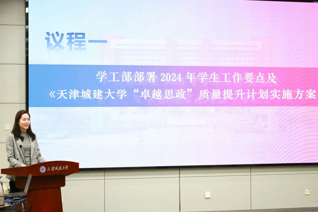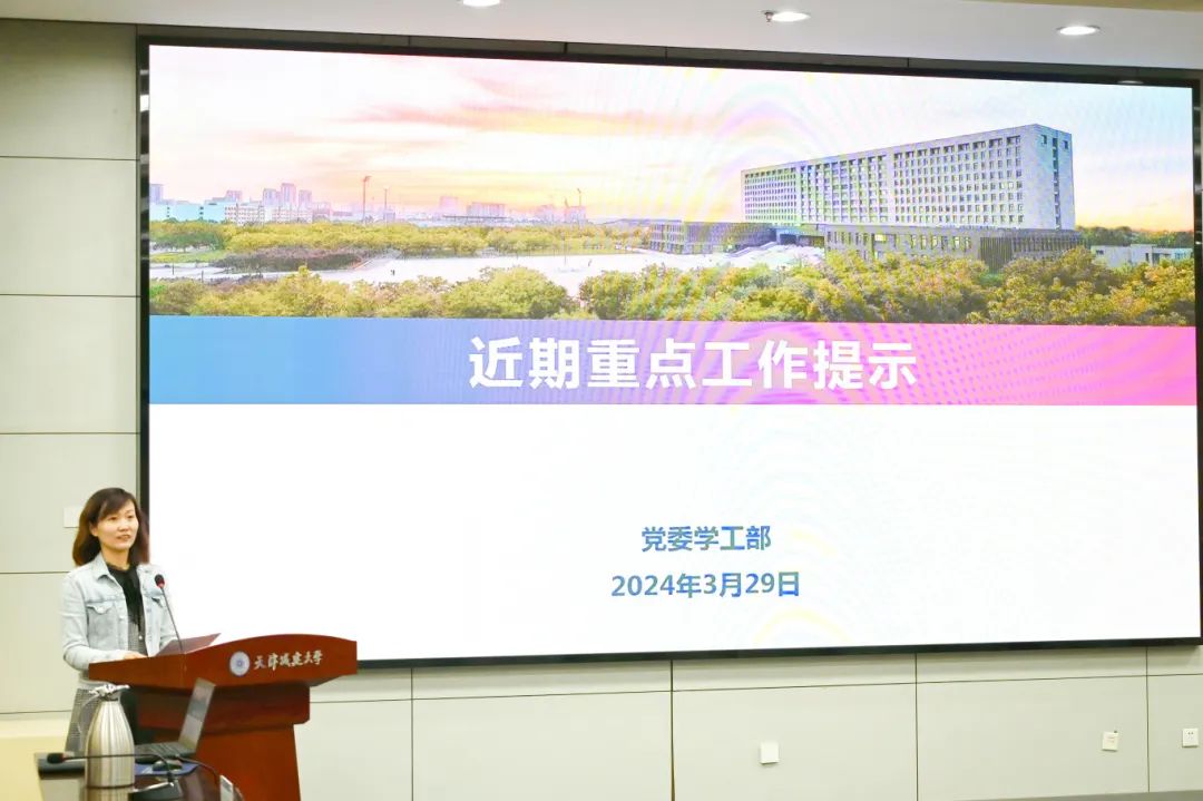 党委学工部副部长王菲部署了2024 年学生工作要点,并详细解读了《Beat365唯一官方网站“卓越思政”质量提升计划实施方案》,就全面落实“城大行动”,高质量推进学生思政工作列出了时间表和任务书。党委学工部副部长孙艳从学生特色活动、党员教育管理、学生资助、心理健康、就业创业、少数民族学生教育管理、一站式学生社区建设和安全稳定工作八个方面重点内容进行了工作提示。