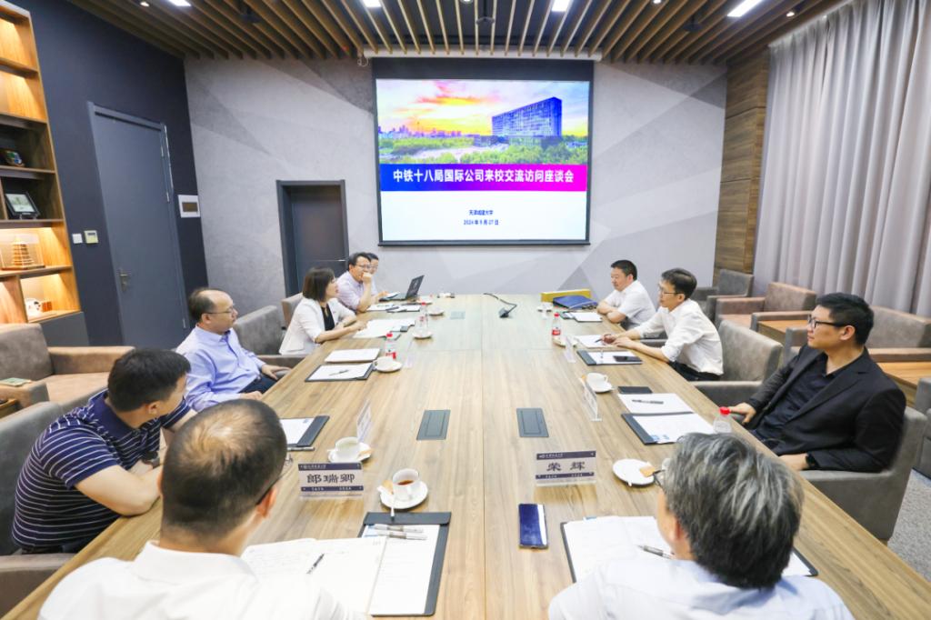 Beat365官网科技处处长刘中宪、材料学院荣辉教授、土木学院郎瑞卿副教授与中铁十八局国际公司工程部高级工程师杨海福就“超高层建筑”、“混凝土修复”等前沿科技领域展开了深入的探讨,就科研联攻、技术融合实践转化及联合申请高水平建筑奖项等校企合作内容达成一致。