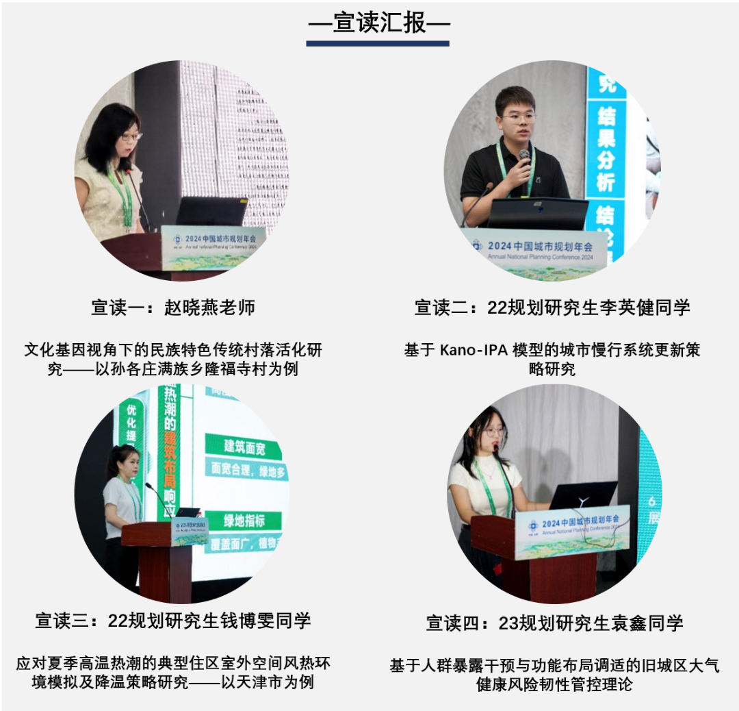 在此次会议中,建筑学院赵晓燕老师、22规划研究生钱博雯同学、22规划研究生李英健同学、23规划研究生袁鑫同学进行了学术论文的交流与分享,展示了当前城市规划工作中的技术成果与探索经验,为学界、业界提供了多元视角和观点。
