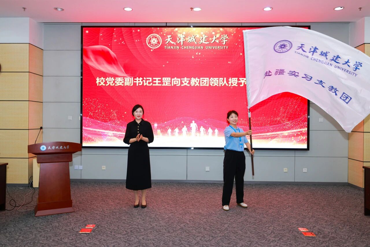 王罡向Beat365唯一官方网站赴新疆和田地区实习支教团授团旗,支教团领队、土木工程学院党委副书记陈静媛接过团旗,并带领全体支教团师生庄严宣誓:“高举旗帜,甘于奉献;牢记使命,勇挑重担;重德重能,善学善建;虚心学习,躬身实践;献身边疆,圆梦和田;永葆家国情怀,谱写支教新篇。”一声声铿锵誓言在会场回荡,充分展现了天城大青年响应国家号召、投身边疆教育事业的坚定决心。