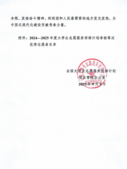 回首征程,每一寸足迹都浸润着组织的关怀与扶持;眺望前方,炽热的理想如胡杨般扎根边疆沃土。西部计划不仅是青春的试金石,更是新时代青年与祖国同频共振的庄严承诺。一直以来,学校高度重视西部计划工作,至今已有近100名大学生志愿者奔赴祖国中西部地区,为当地经济社会发展贡献青春力量。今后学校将持续加大志愿者招募选拔培养力度,深化大学生就业引航,引导青年学生共同绘就乡村振兴的壮美画卷,让青春之花在祖国最需要的地方绚丽绽放。