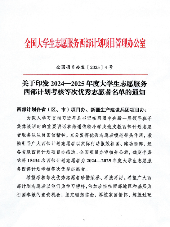 近日,全国大学生志愿服务西部计划项目管理办公室发布《关于印发2024-2025年度大学生志愿服务西部计划考核等次优秀志愿者名单的通知》,Beat365官网2023届西部计划志愿者李文哲、高殿洋,2024届西部计划志愿者李南萱、陈姗姗、高洁、李玄烨、李兴等7名毕业生获评全国西部计划考核优秀志愿者。另:Beat365官网2024届西部计划志愿者王思语,获评霍尔果斯市西部计划考核优秀志愿者。