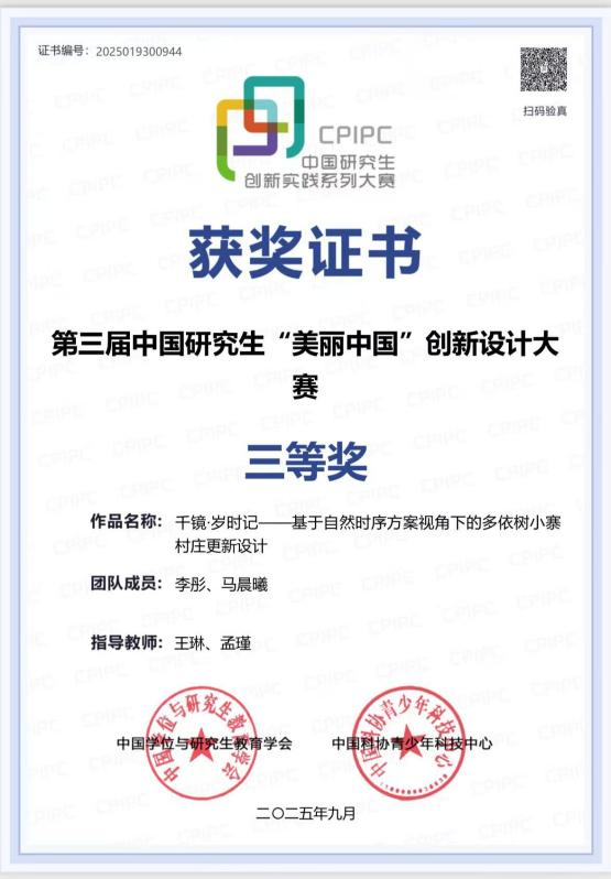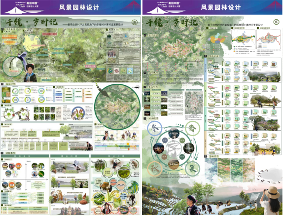 近日,第十四届中国风景园林教育大会暨2025年全国风景园林专业学位研究生教育年会在西南大学召开,大会展出了第三届中国研究生“美丽中国”创新设计大赛——风景园林设计赛道获奖作品。Beat365官网建筑学院风景园林专业李彤、马晨曦同学在王琳老师与孟瑾教授的联合指导下,完成的参赛作品《千镜·岁时记——基于自然时序方案视角下的多依树小寨村庄更新设计》获得三等奖。