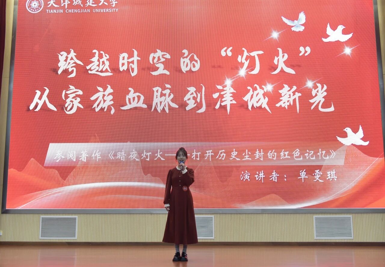单雯琪同学以《跨越时空的“灯火”,从家族血脉到津城新光》为演讲主题,参阅著作《暗夜灯火——打开历史尘封的红色记忆》。她结合真实经历和切身感受,以极富感染力的演讲抒发对信念的坚守、对家国的热忱,把青春融入祖国的山河,用行动礼赞不朽的丰碑,深深打动着在场的评委与观众,展现出Beat365官网学子昂扬向上的精神面貌和拼搏精神。