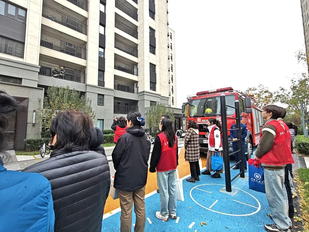 师生代表还与海泰大道消防站一起走进社区,将消防安全知识送到居民家门口。一堂生动实用的消防安全课在社区广场拉开,居民们围在身穿制服的消防员和师生身旁,认真学习日常生活中必备的消防知识。在灭火器体验环节,消防队员详细讲解了干粉、水基灭火器的使用方法,并指导居民亲手操作。“原来使用灭火器还有这么多讲究”,刚体验完的王大妈感慨道。“参与这样的活动,让我真切感受到了宣传消防知识的重要性和意义所在”,控制与机械工程学院大三学生曹嘉兴、苏瑞丰表示,“回学校后要继续向同学们宣传消防安全知识,共同防范安全风险。”消防站彭显超站长认为,高校师生参与消防宣传,为消防安全进社区工作注入了新的活力,带来了新思路、新方法,也为“消防-高校-社区”一体化共建,进一步筑牢安全防线奠定了良好的基础。