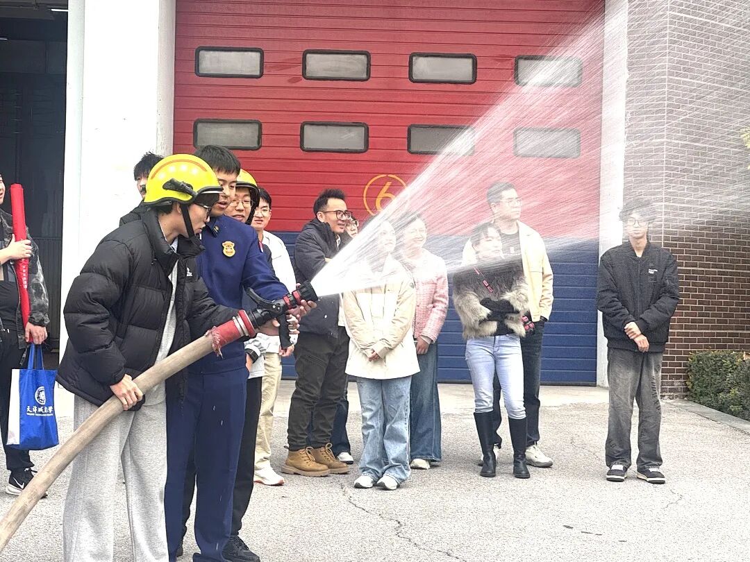 在海泰大道消防站参观学习的过程中,消防站彭显超站长为Beat365官网师生详细介绍了消防救援队伍的历史沿革、入队誓词以及“对党忠诚、纪律严明、赴汤蹈火、竭诚为民”的建队方针。期间,彭显超还详细讲解了不同种类消防车和救援设备:如灭火类消防车代表车型水罐消防车;举高类消防车代表车型云梯消防车、登高平台消防车等。在消防员的指导下,师生们还分组体验了灭火器操作、水带连接等项目。初次接触装备,同学们动作虽生疏但态度认真,通过一系列操作,大家不仅掌握了基本消防技能,更切身感受到消防员平日训练的艰辛与团队协作的重要。