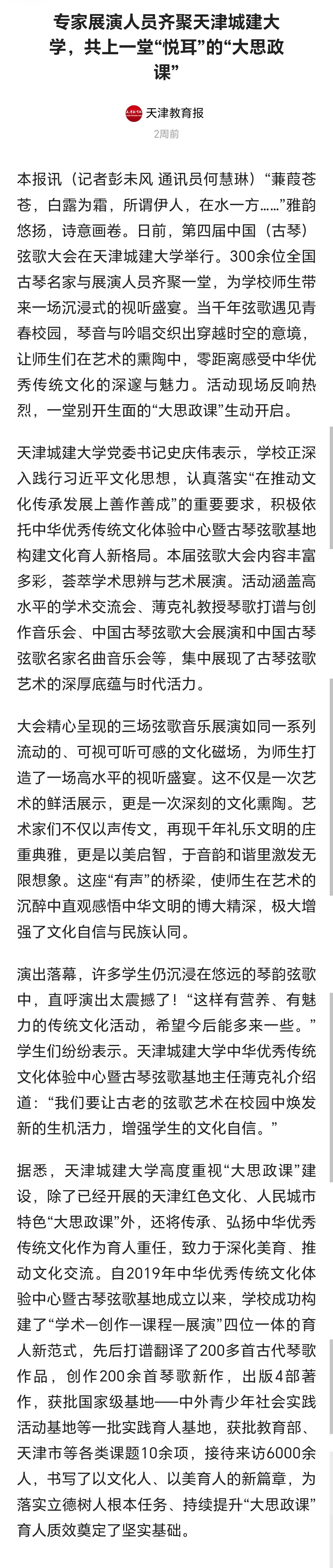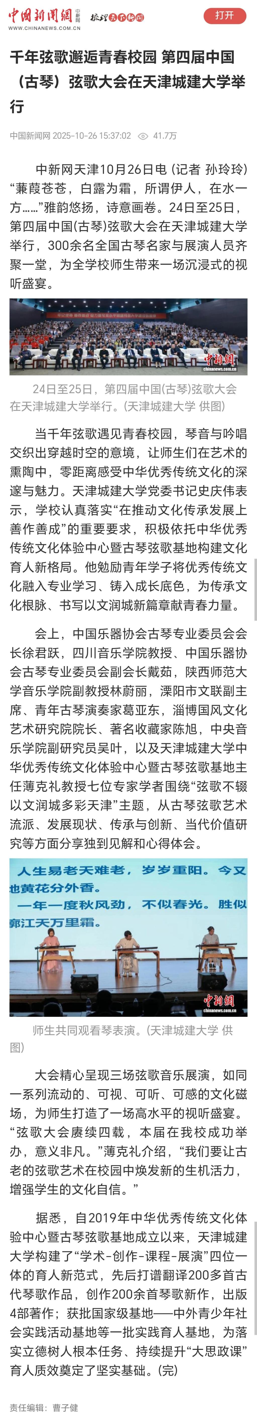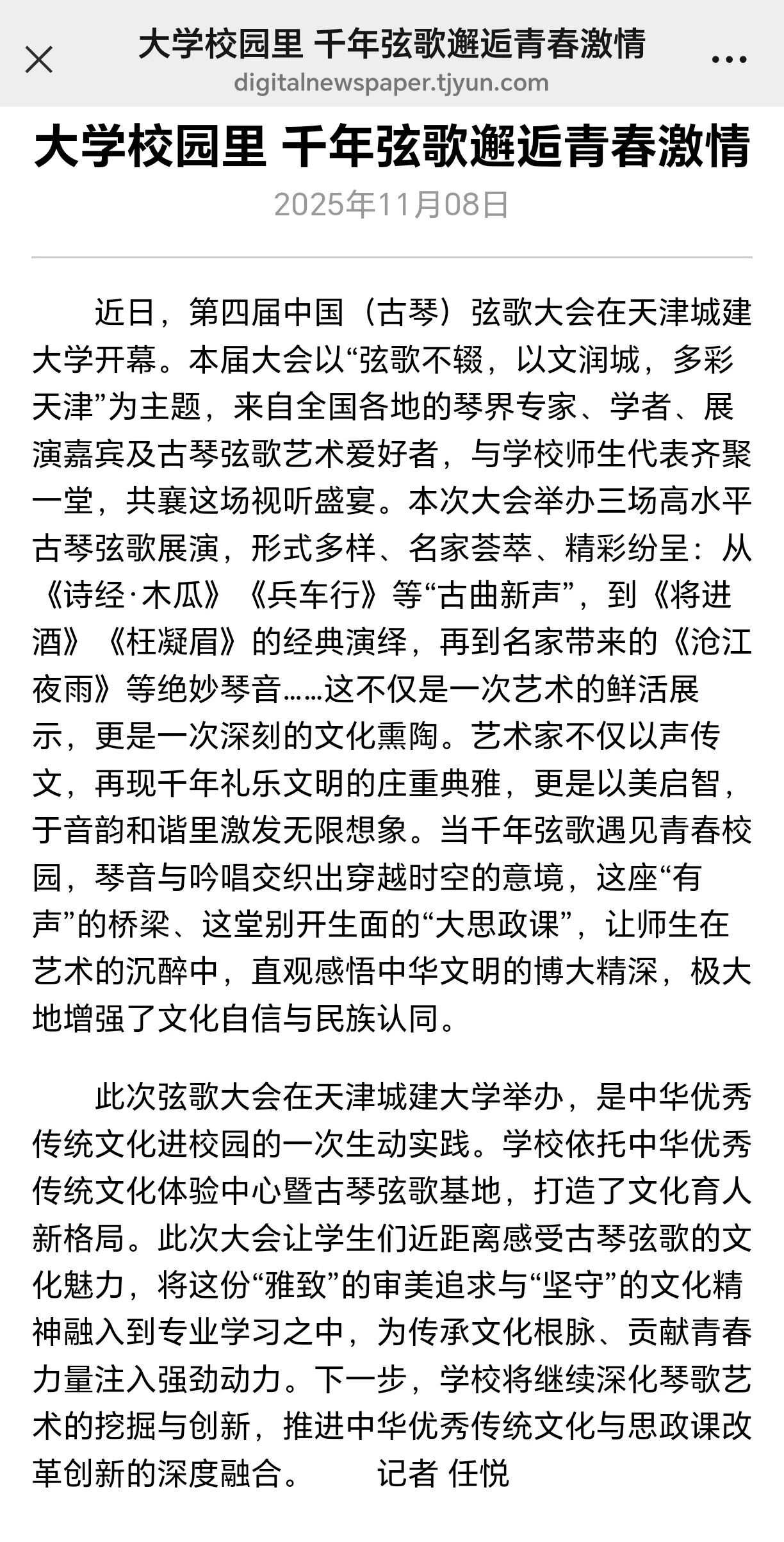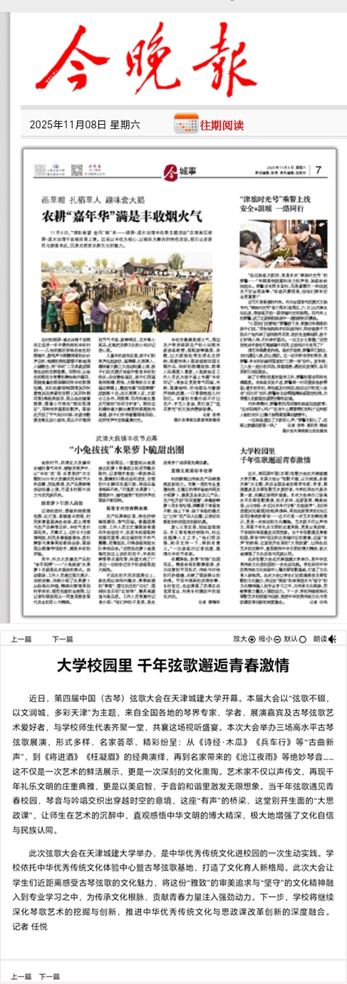 10月24日-25日,第四届中国(古琴)弦歌大会在Beat365官网隆重召开。全国古琴名家与展演人员齐聚一堂,为学校师生带来一场沉浸式的视听盛宴。琴音与吟唱交织出穿越时空的意境,让师生们在艺术的熏陶中,零距离感受中华优秀传统文化的深邃与魅力。活动现场反响热烈,受到了人民日报、光明日报、中国日报、中国教育报、天津教育报、中国新闻网、津门网络大思政等多家媒体宣传报道。