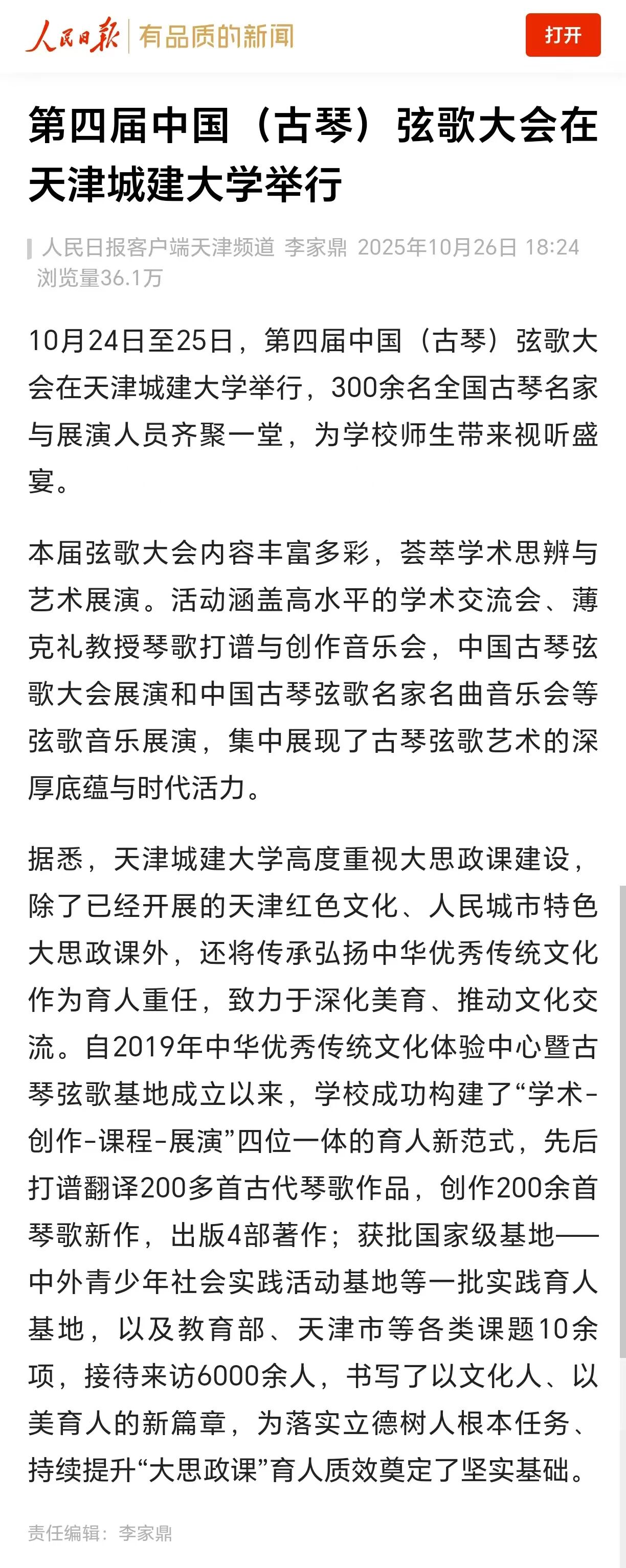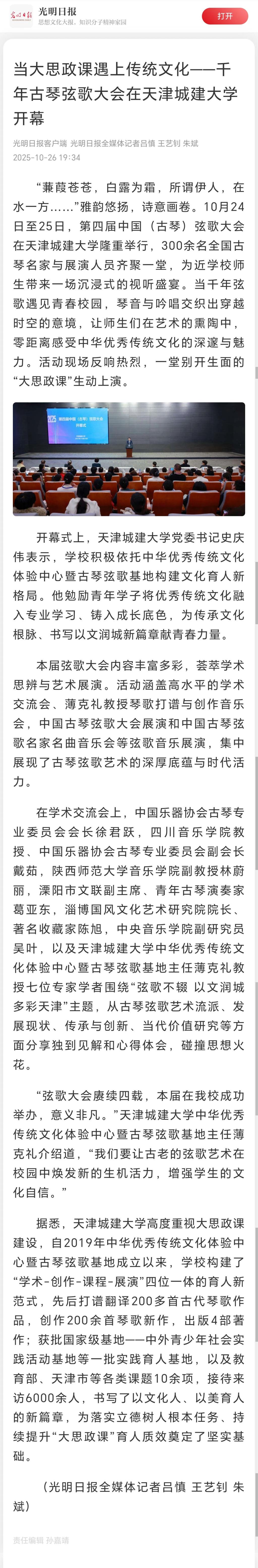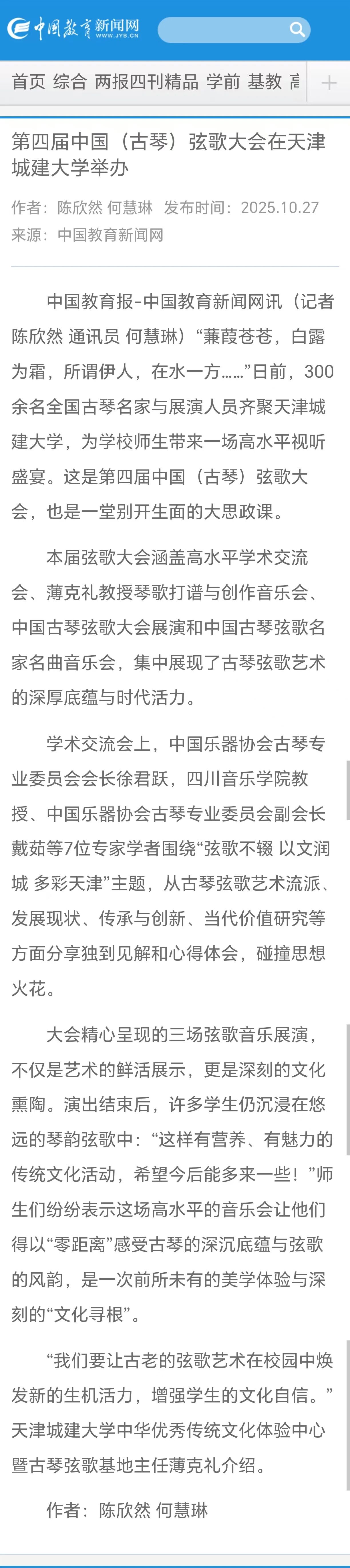 10月24日-25日,第四届中国(古琴)弦歌大会在Beat365官网隆重召开。全国古琴名家与展演人员齐聚一堂,为学校师生带来一场沉浸式的视听盛宴。琴音与吟唱交织出穿越时空的意境,让师生们在艺术的熏陶中,零距离感受中华优秀传统文化的深邃与魅力。活动现场反响热烈,受到了人民日报、光明日报、中国日报、中国教育报、天津教育报、中国新闻网、津门网络大思政等多家媒体宣传报道。