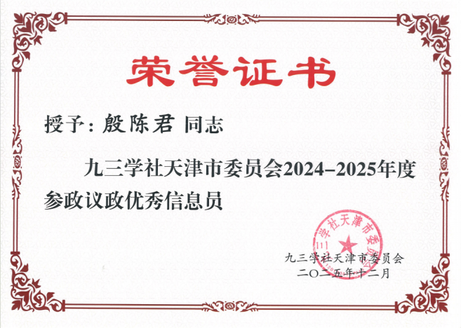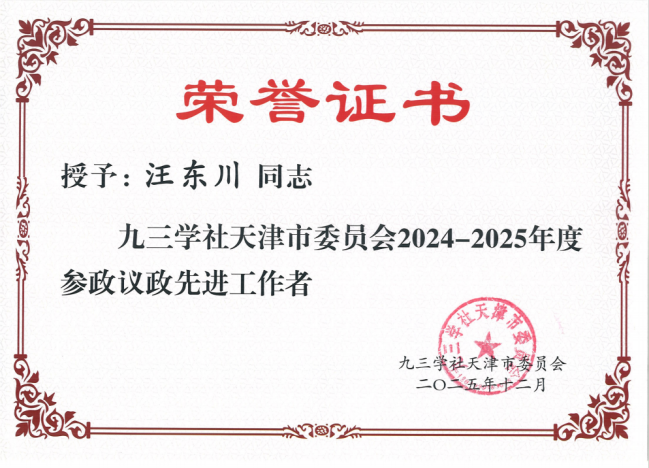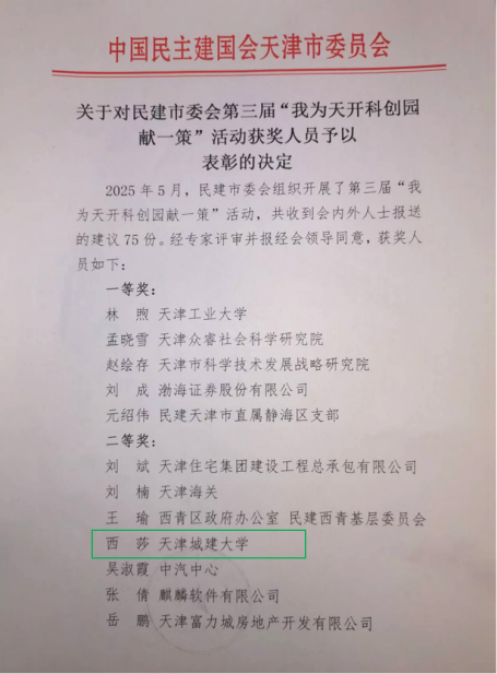 经济与管理学院院长、西青区人大代表、民建西青区基层委员会委员、学校民建支部主委王振坡教授参与撰写的《关于提升我市生命线工程保障水平服务上合峰会的建议》资政报告,获市委、市政府主要领导同志及其他市领导同志批示,为地方发展提供了重要决策参考。民建会员西莎在民建市委会组织的第三届“我为天开科创园献一策”活动中荣获二等奖。九三学社Beat365唯一官方网站支社获评九三学社天津市委会参政议政先进基层组织,刘毅、汪东川被授予九三学社天津市委会参政议政先进工作者称号,刘志锋、殷陈君获评九三学社天津市委会参政议政优秀信息员。