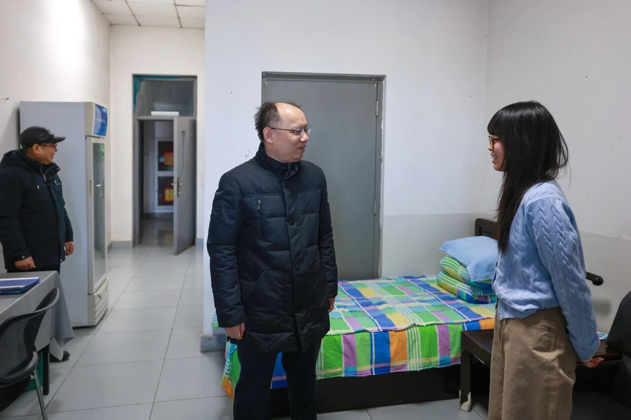 岁寒情愈暖,年近意更浓。校领导一行先后来到学校总值班室、安防监控中心、第二学生餐厅、学生公寓等值班值守点位,实地检查春节期间校园服务保障与安全管理工作,与在岗的保卫人员、后勤职工、宿舍管理员、餐饮服务人员等亲切交谈、互致问候。每到一处,王中良都详细询问各岗位假期运行保障、安全责任落实、应急值守安排以及工作人员的生活情况,对大家过去一年为保障学校正常运转、服务师生学习生活所付出的辛勤努力表示衷心感谢,并为大家送上了寓意吉祥的新春慰问礼包。