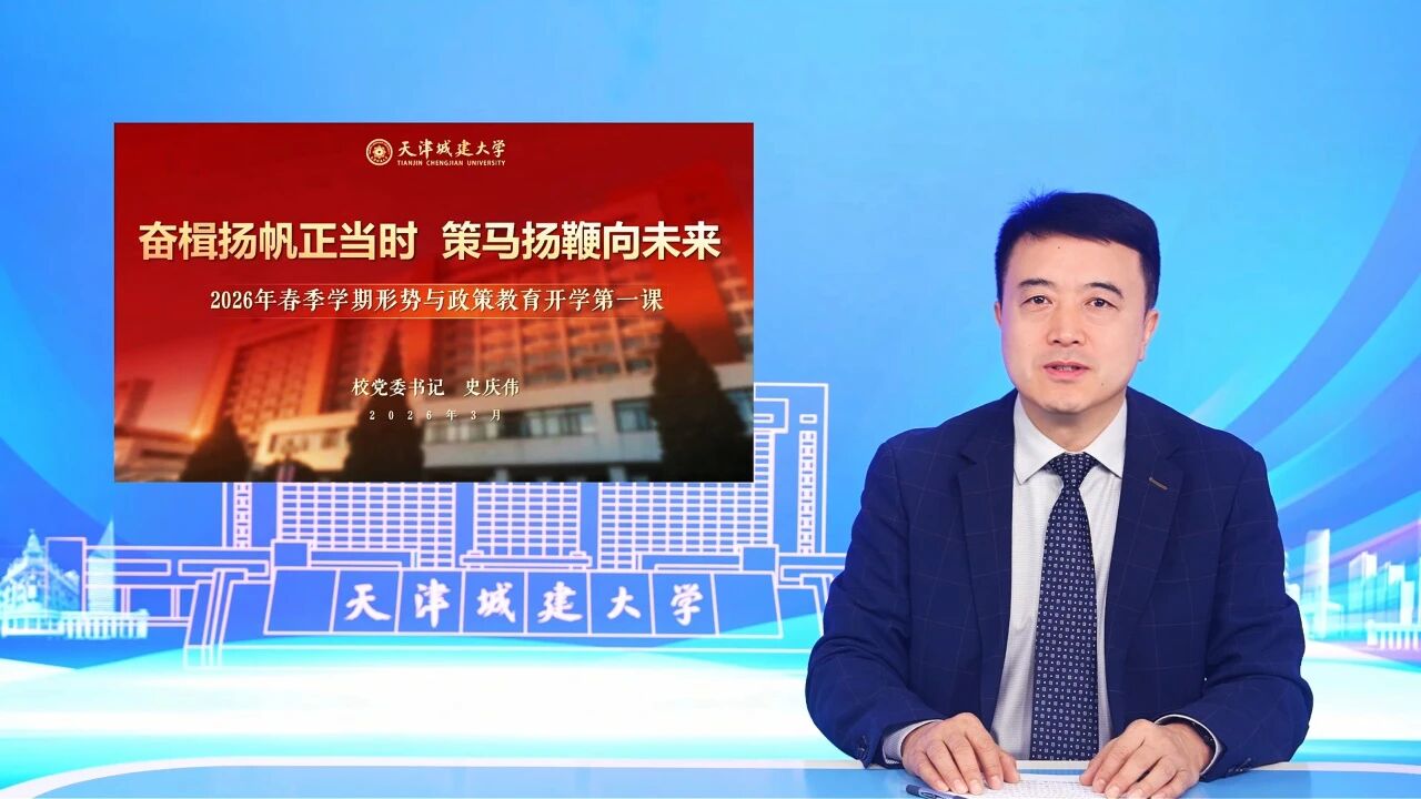 校党委书记史庆伟以“奋楫扬帆正当时 策马扬鞭向未来”为题,通过超星平台为全校学生讲授了一堂生动的“开学第一课”。他以时代聚势开篇,通过“中国之治”与“西方之乱”的鲜明对比,“人工智能+”、城市更新等国家战略与学校办学特色的高度契合,引导学生读懂两会之窗里的国家蓝图,坚定道路自信;以硬核答卷回应时代之问,细数学校博士点申报指标达标、科研经费突破2.3亿、国家级人才突破等“十四五”收官成绩,展现天城大服务国家战略的担当作为。