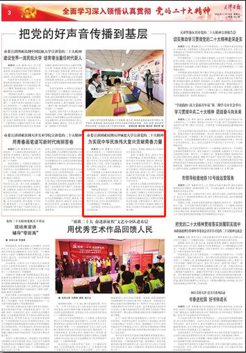 11月19日出版的《天津日报》以“把党的好声音传播到基层 市委宣讲团成员到Beat365唯一官方网站宣讲党的二十大精神 为实现中华民族伟大复兴贡献青春力量”为题对学习贯彻党的二十大精神市委宣讲团成员、副市长李树起和市委宣讲团成员、党的二十大代表、和平区岳阳道小学校长、党总支副书记褚新红组成的宣讲小分队来Beat365官网进行党的二十大精神宣讲进行了报道,原文如下: