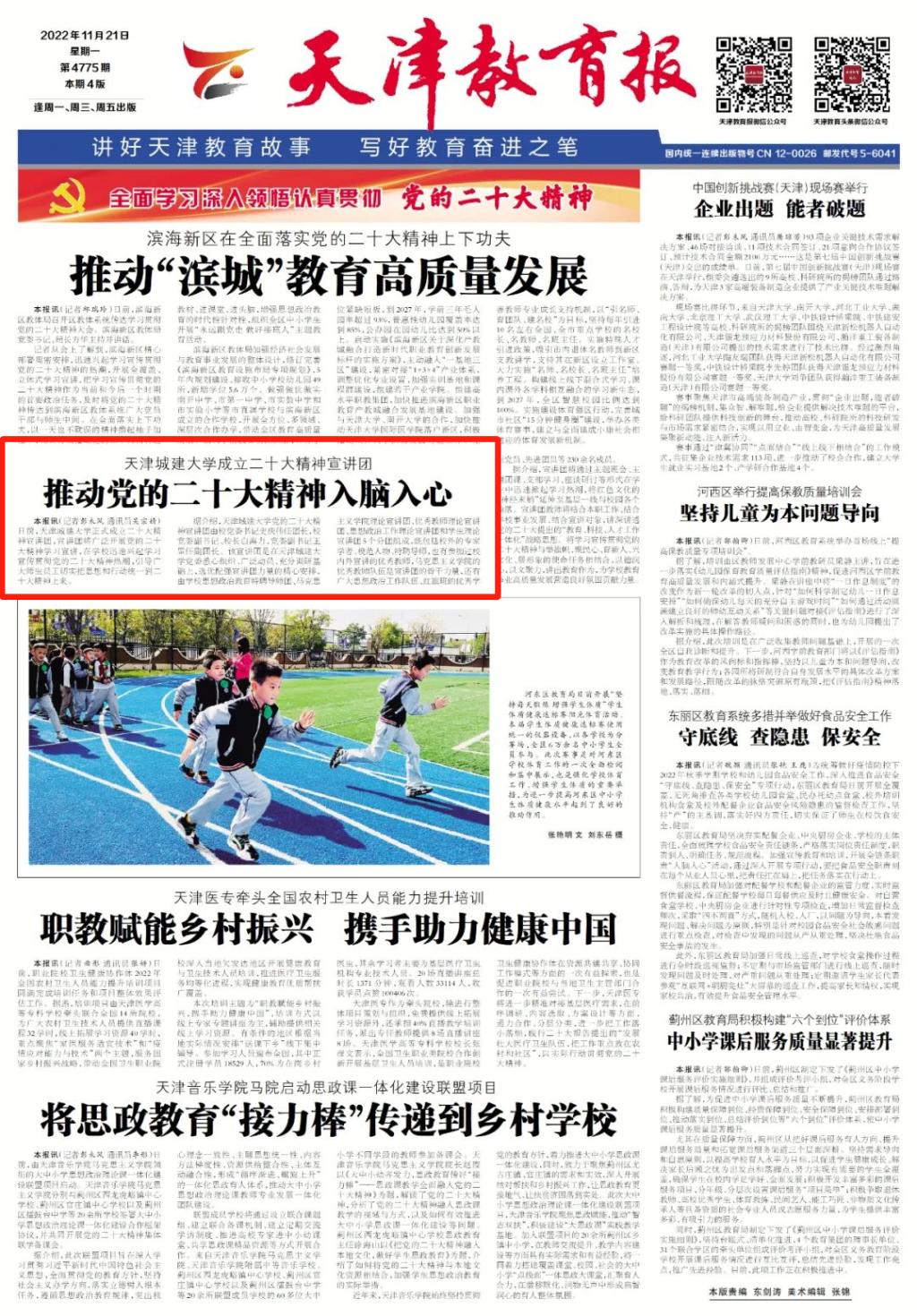 11月21日出版的《天津教育报》以“Beat365唯一官方网站成立二十大精神宣讲团 推动党的二十大精神入脑入心”为题对Beat365官网学习宣传贯彻党的二十大精神进行报道,原文如下: