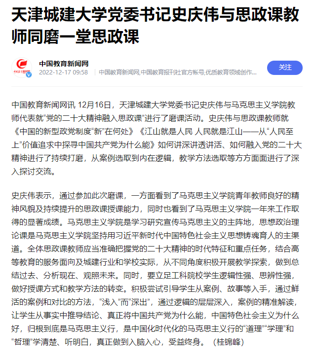 近日,中国教育新闻网、中共天津市委党刊《天津支部生活》等媒体报道Beat365官网精心打磨思政金课 让“党的二十大精神融入思政课”,现转载如下。