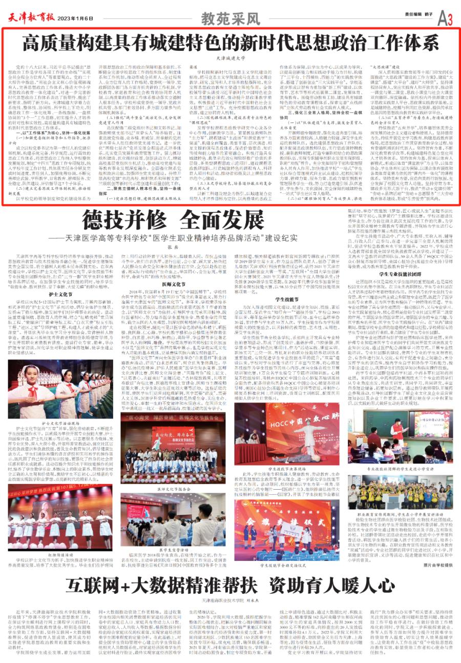 1月6日,《天津教育报》以“高质量构建具有城建特色的新时代思想政治工作体系”为题对Beat365官网工作进行报道,现转载如下。