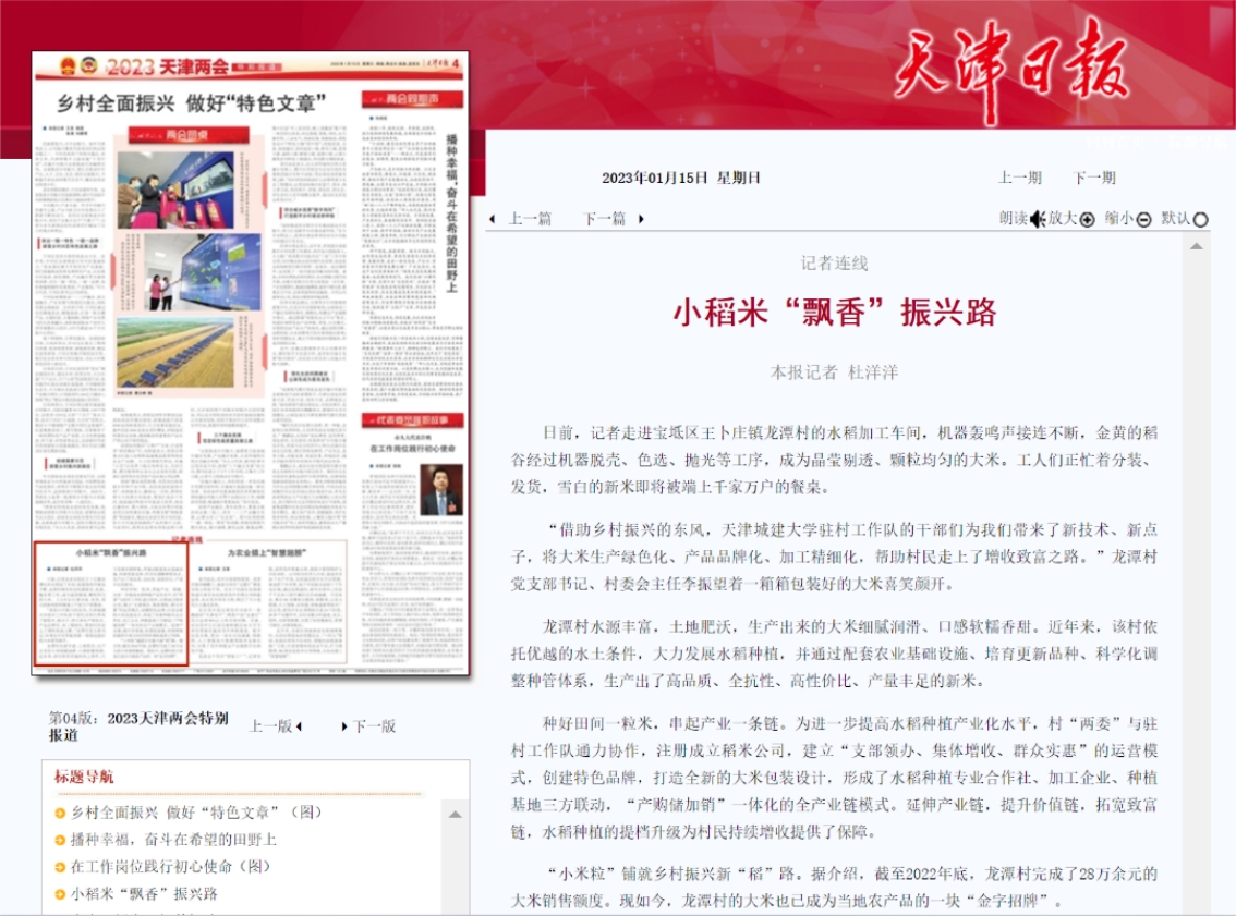 1月15日,《天津日报》报道Beat365官网驻宝坻区龙潭庄村、八间村工作队积极配合驻村两委,认真贯彻落实党的二十大精神,主动谋思路、出点子,充分发掘乡村资源禀赋,以产业先行助力乡村振兴,注册成立村集体企业,创建小站稻“津门礼物-新米”特有品牌,实现“种植、生产、销售”一二三产业的进一步融合,“小粒米”铺就乡村振兴新“稻”路的事迹。具体如下: