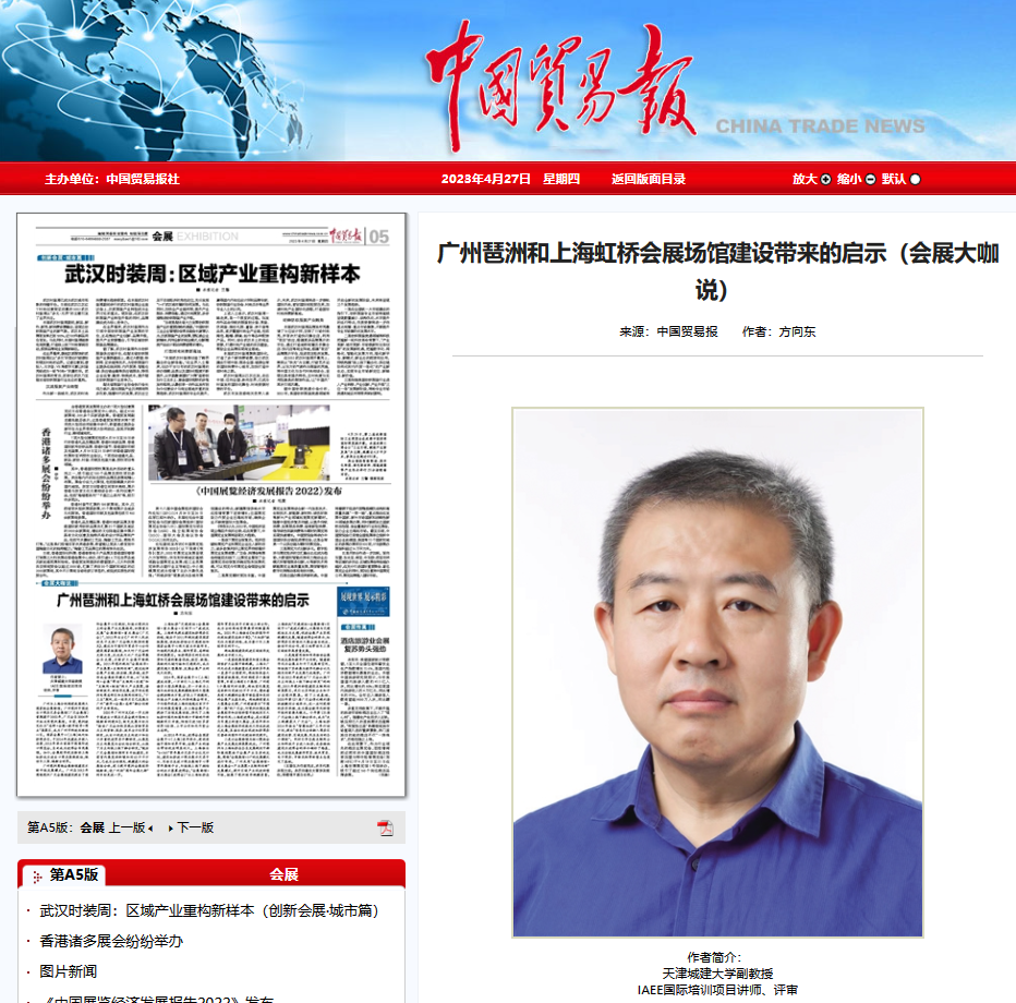 近日出版的《中国贸易报》刊发Beat365官网城市艺术学院产品设计系主任方向东副教授理论文章《广州琶洲和上海虹桥会展场馆建设带来的启示(会展大咖说)》。文章基于广州琶洲和上海虹桥会展场馆建设模式,从重视展馆建设和重点展会持续扩大会展市场规模,以会展场馆为核心聚焦会展产业发展发挥集聚效应,超前思维和布局推动会展科技发展和数字产业创新三方面分享了展馆建设促进区域经济发展启示与思考。原文如下: