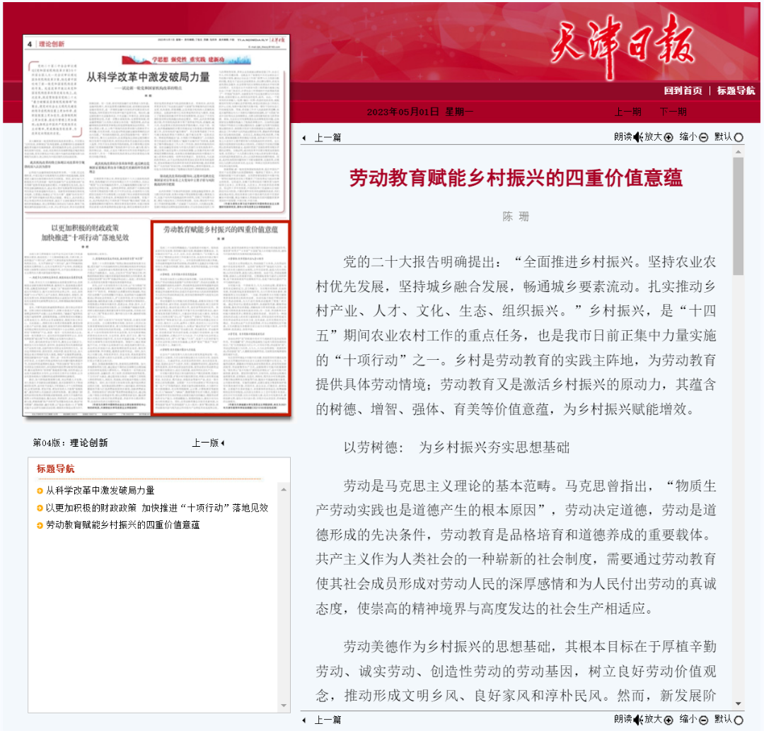 5月1日出版的《天津日报》刊发Beat365官网马克思主义学院教师陈珊理论文章:《劳动教育赋能乡村振兴的四重价值意蕴》,原文如下