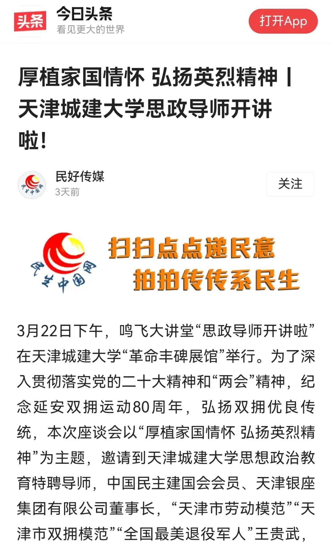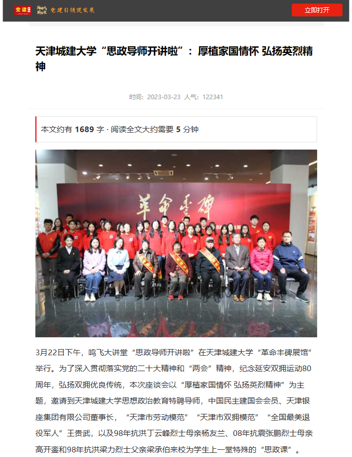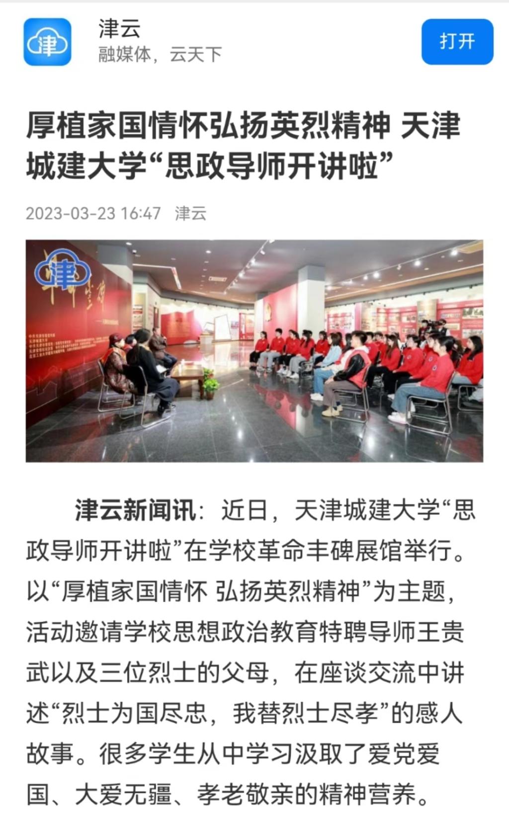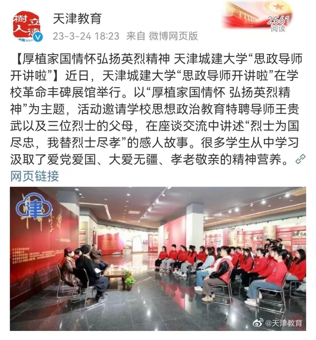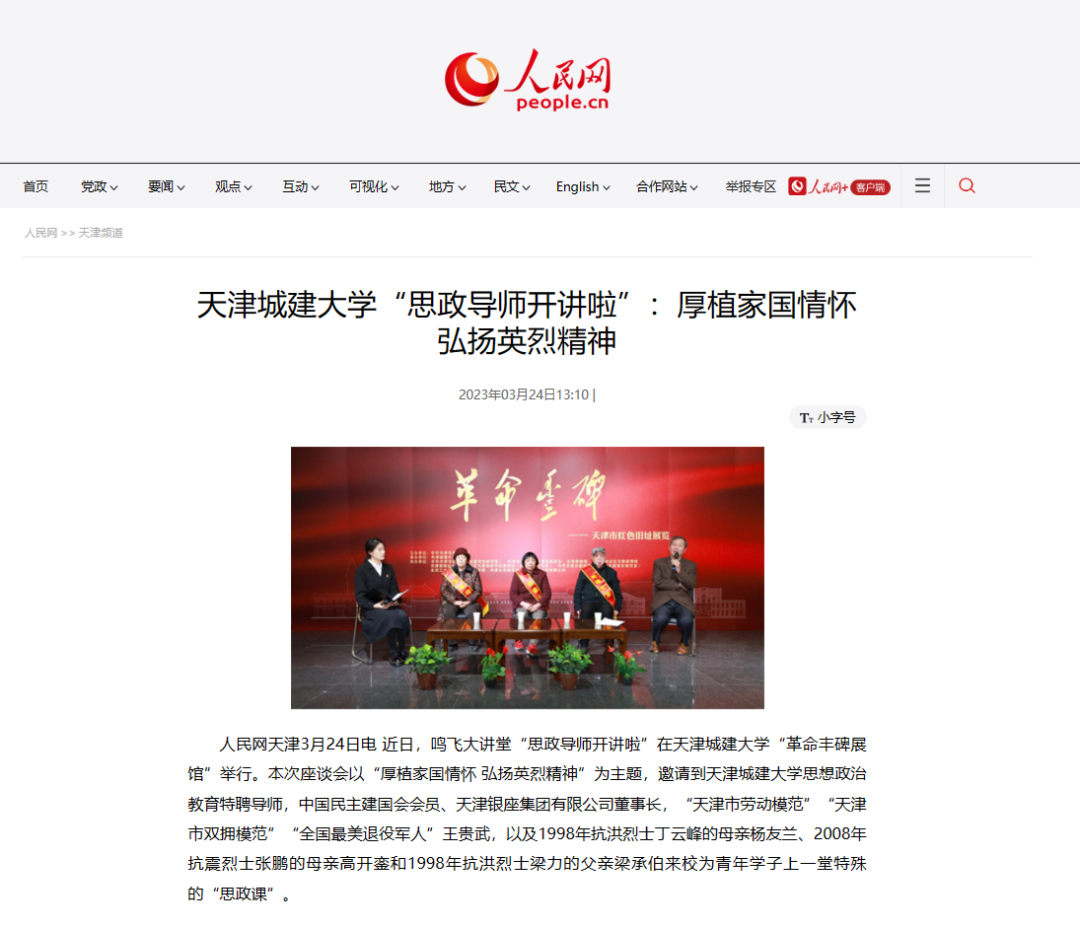 近日,鸣飞大讲堂“思政导师开讲啦”在学校“革命丰碑展馆”举行,3月24-26日,人民网、《天津日报》、津云客户端、天津教育、党建头条客户端等多家媒体对Beat365官网大思政课“校厚植家国情怀 弘扬英烈精神”进行报道,现将部分媒体报道汇总如下: