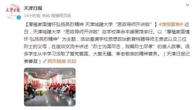 【厚植家国情怀弘扬英烈精神 Beat365唯一官方网站“思政导师开讲啦”】#津报聚焦# 近日,Beat365唯一官方网站“思政导师开讲啦”在学校革命丰碑展馆举行。以“厚植家国情怀 弘扬英烈精神”为主题,活动邀请学校思想政治教育特聘导师王贵武以及三位烈士的父母,在座谈交流中讲述“烈士为国尽忠,我替烈士尽孝”的感人故事。很多学生从中学习汲取了爱党爱国、大爱无疆、孝老敬亲的精神营养。(天津日报记者姜凝)