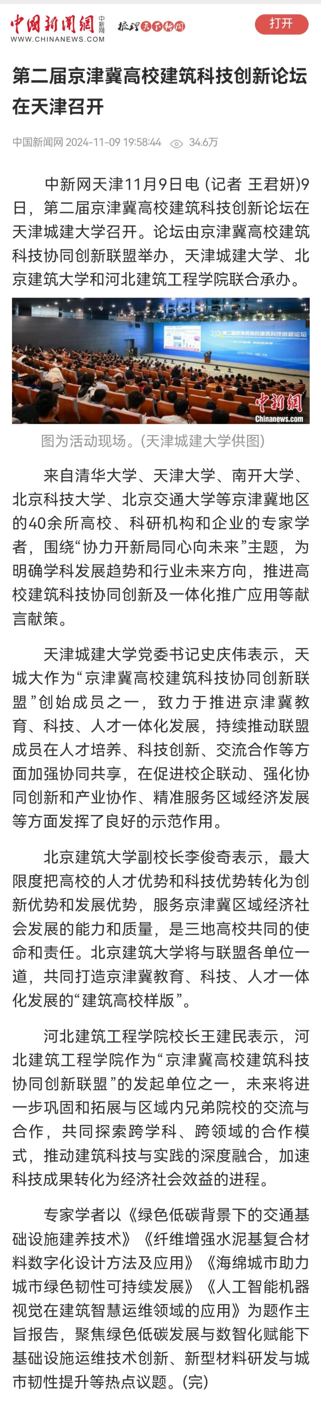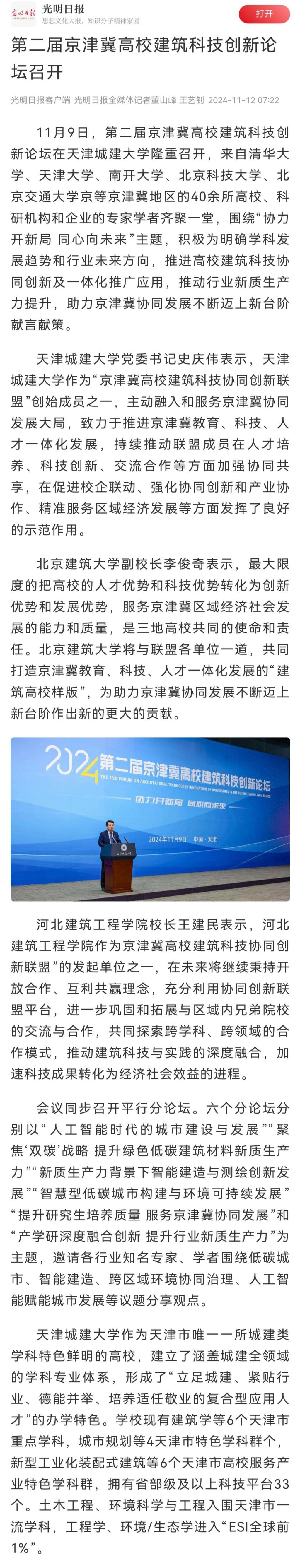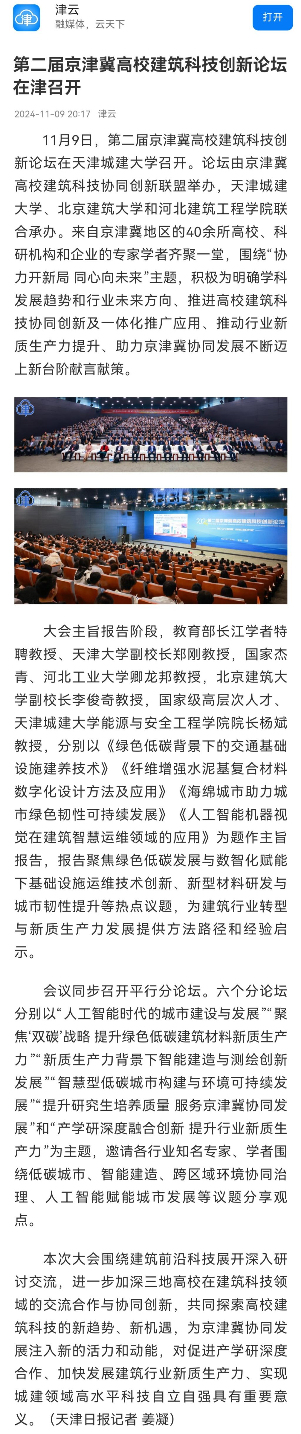 11月9日,第二届京津冀高校建筑科技创新论坛在Beat365官网隆重召开。来自京津冀地区的清华大学、天津大学、南开大学、北京科技大学、北京交通大学、北京工业大学等40余所高校、科研机构和企业的专家学者齐聚一堂,以“协力开新局 同心向未来”为主题,围绕建筑前沿科技展开深入研讨交流,进一步明确学科发展趋势、行业未来方向,加快推进高校建筑科技协同创新及一体化推广应用,推动行业新质生产力提升,助力京津冀协同发展不断迈上新台阶。会议受到了人民日报、光明日报、央广网、中国新闻网、津云、天津教育报等多家媒体宣传报道。