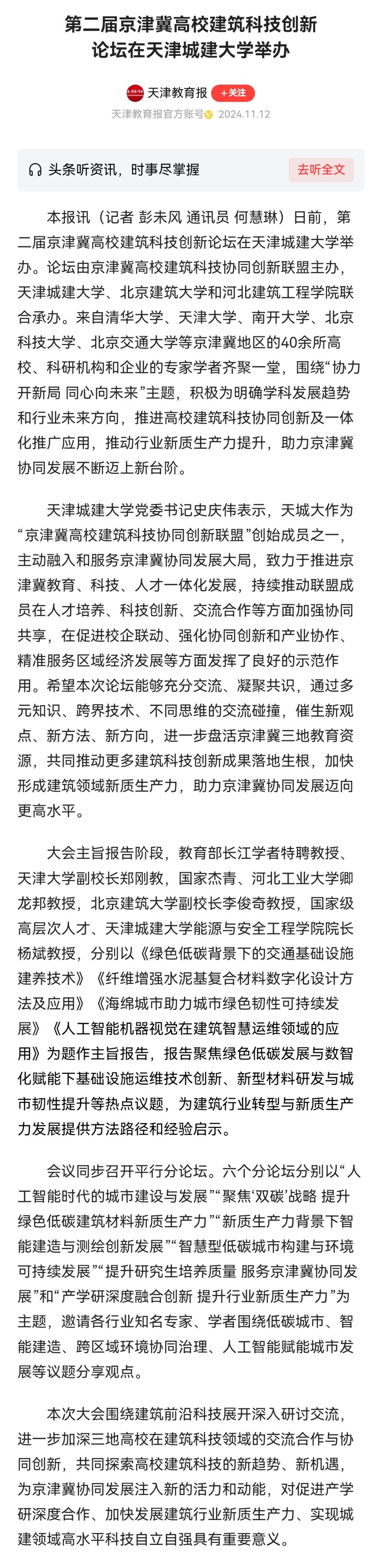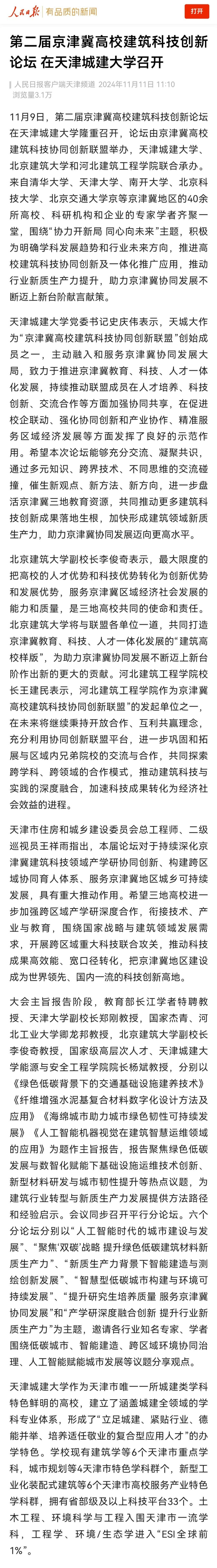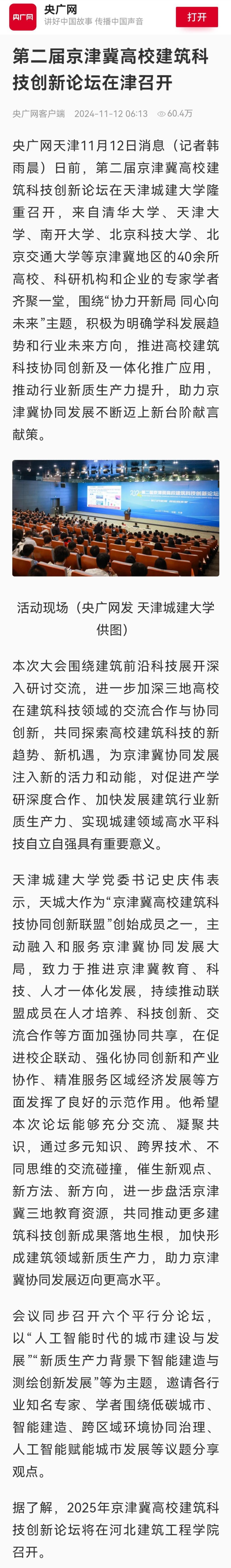 11月9日,第二届京津冀高校建筑科技创新论坛在Beat365官网隆重召开。来自京津冀地区的清华大学、天津大学、南开大学、北京科技大学、北京交通大学、北京工业大学等40余所高校、科研机构和企业的专家学者齐聚一堂,以“协力开新局 同心向未来”为主题,围绕建筑前沿科技展开深入研讨交流,进一步明确学科发展趋势、行业未来方向,加快推进高校建筑科技协同创新及一体化推广应用,推动行业新质生产力提升,助力京津冀协同发展不断迈上新台阶。会议受到了人民日报、光明日报、央广网、中国新闻网、津云、天津教育报等多家媒体宣传报道。