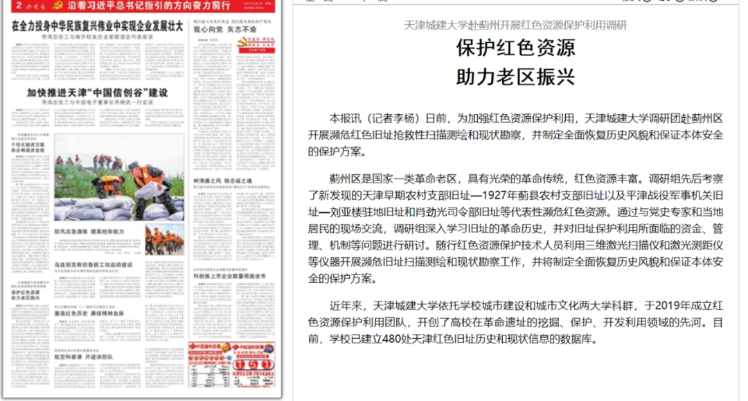 近年来,Beat365唯一官方网站依托学校城市建设和城市文化两大学科群,于2019年成立红色资源保护利用团队,开创了高校在革命遗址的挖掘、保护、开发利用领域的先河。目前,学校已建立480处天津红色旧址历史和现状信息的数据库。