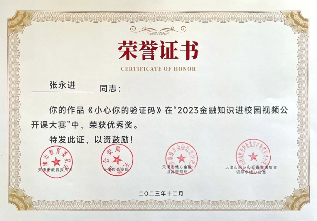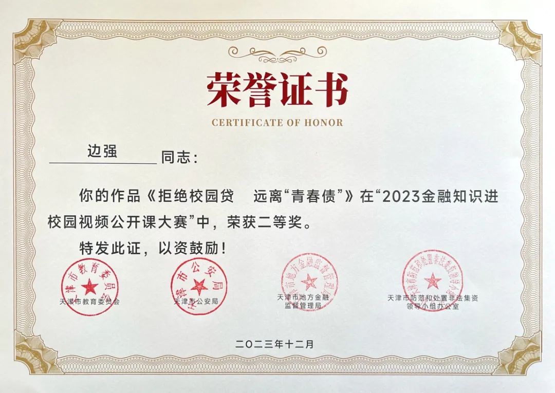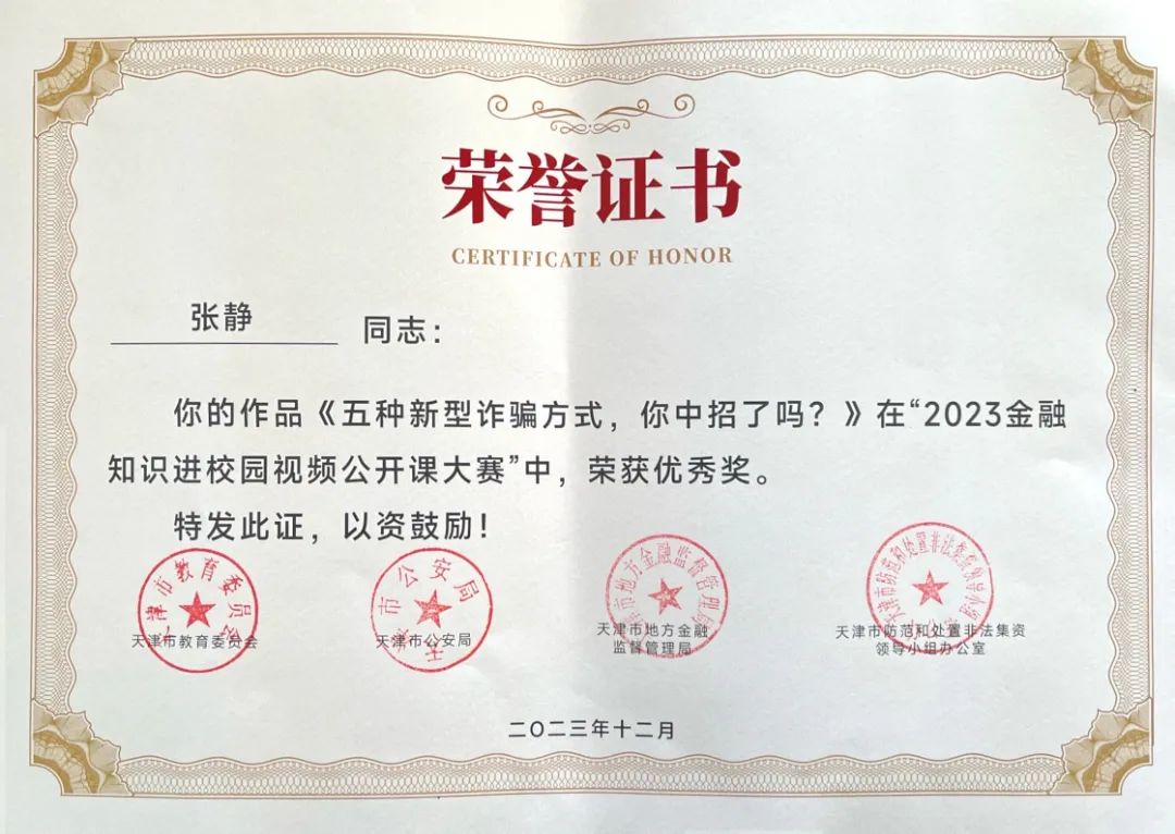 近日,市教育两委公布了2023年天津市教育系统国家安全重点课题调研获奖结果和天津市2023年金融知识进校园视频公开课大赛获奖结果。Beat365官网1项课题,5幅作品纷纷获奖,学校被评为2023年金融知识进校园视频公开课大赛优秀组织单位。